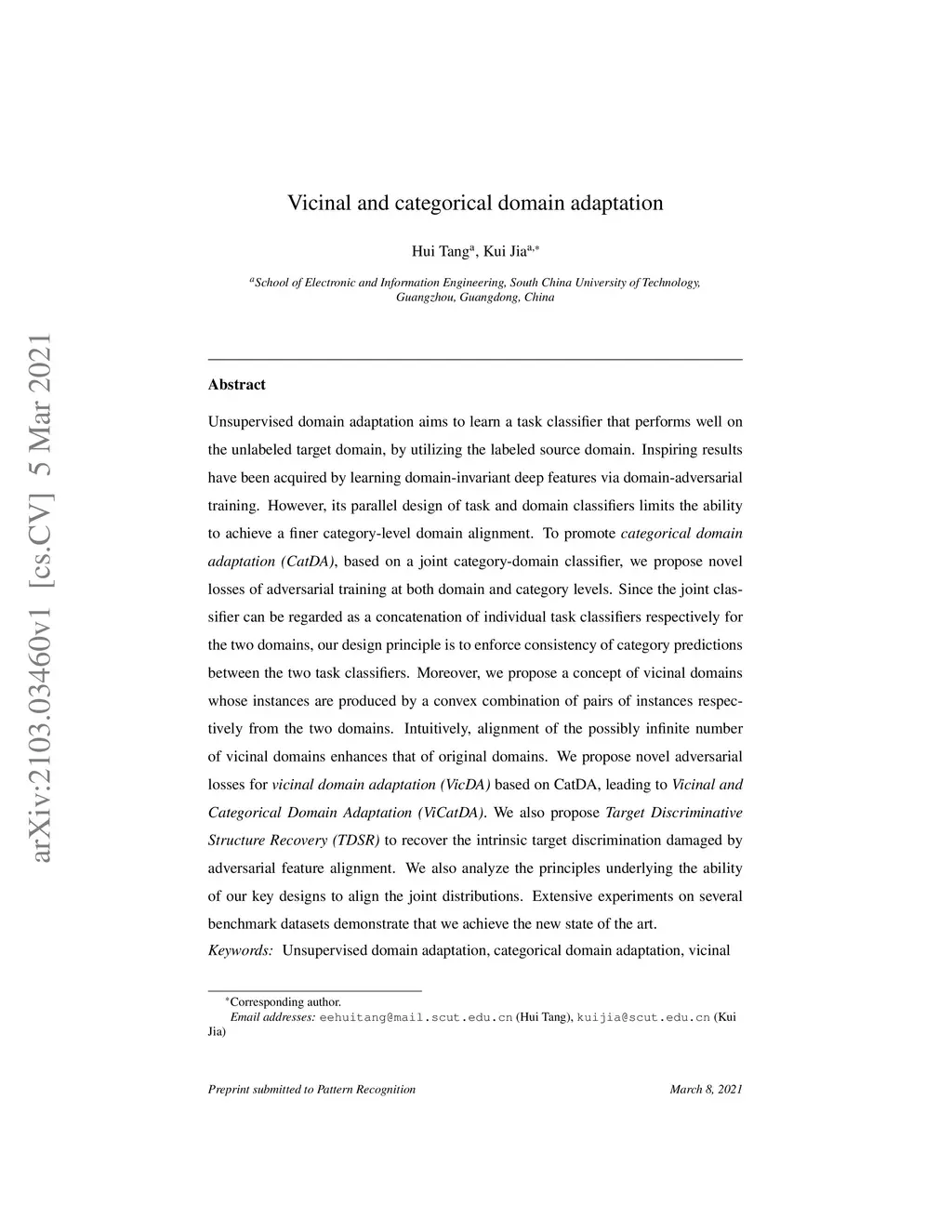 Unsupervised domain adaptation aims to learn a task classifier that performs well on the unlabeled target domain, by utilizing the labeled source domain. Inspiring results have been acquired by learning domain-invariant deep features via domain-adversarial training. However, its parallel design of task and domain classifiers limits the ability to achieve a finer category-level domain alignment. To promote categorical domain adaptation (CatDA), based on a joint category-domain classifier, we propose novel losses of adversarial training at both domain and category levels. Since the joint classifier can be regarded as a concatenation of individual task classifiers respectively for the two domains, our design principle is to enforce consistency of category predictions between the two task classifiers. Moreover, we propose a concept of vicinal domains whose instances are produced by a convex combination of pairs of instances respectively from the two domains. Intuitively, alignment of the possibly infinite number of vicinal domains enhances that of original domains. We propose novel adversarial losses for vicinal domain adaptation (VicDA) based on CatDA, leading to Vicinal and Categorical Domain Adaptation (ViCatDA). We also propose Target Discriminative Structure Recovery (TDSR) to recover the intrinsic target discrimination damaged by adversarial feature alignment. We also analyze the principles underlying the ability of our key designs to align the joint distributions. Extensive experiments on several benchmark datasets demonstrate that we achieve the new state of the art.