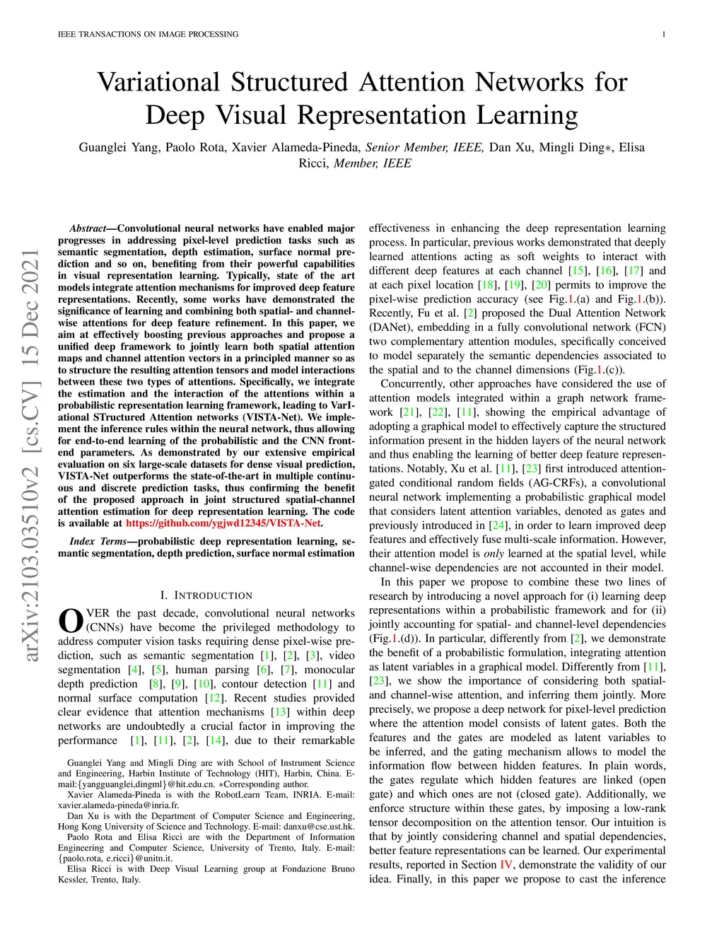 Convolutional neural networks have enabled major progresses in addressing pixel-level prediction tasks such as semantic segmentation, depth estimation, surface normal prediction and so on, benefiting from their powerful capabilities in visual representation learning. Typically, state of the art models integrate attention mechanisms for improved deep feature representations. Recently, some works have demonstrated the significance of learning and combining both spatial- and channelwise attentions for deep feature refinement. In this paper, weaim at effectively boosting previous approaches and propose a unified deep framework to jointly learn both spatial attention maps and channel attention vectors in a principled manner so as to structure the resulting attention tensors and model interactions between these two types of attentions. Specifically, we integrate the estimation and the interaction of the attentions within a probabilistic representation learning framework, leading to VarIational STructured Attention networks (VISTA-Net). We implement the inference rules within the neural network, thus allowing for end-to-end learning of the probabilistic and the CNN frontend parameters. As demonstrated by our extensive empirical evaluation on six large-scale datasets for dense visual prediction, VISTA-Net outperforms the state-of-the-art in multiple continuous and discrete prediction tasks, thus confirming the benefit of the proposed approach in joint structured spatial-channel attention estimation for deep representation learning. The code is available at https://github.com/ygjwd12345/VISTA-Net.