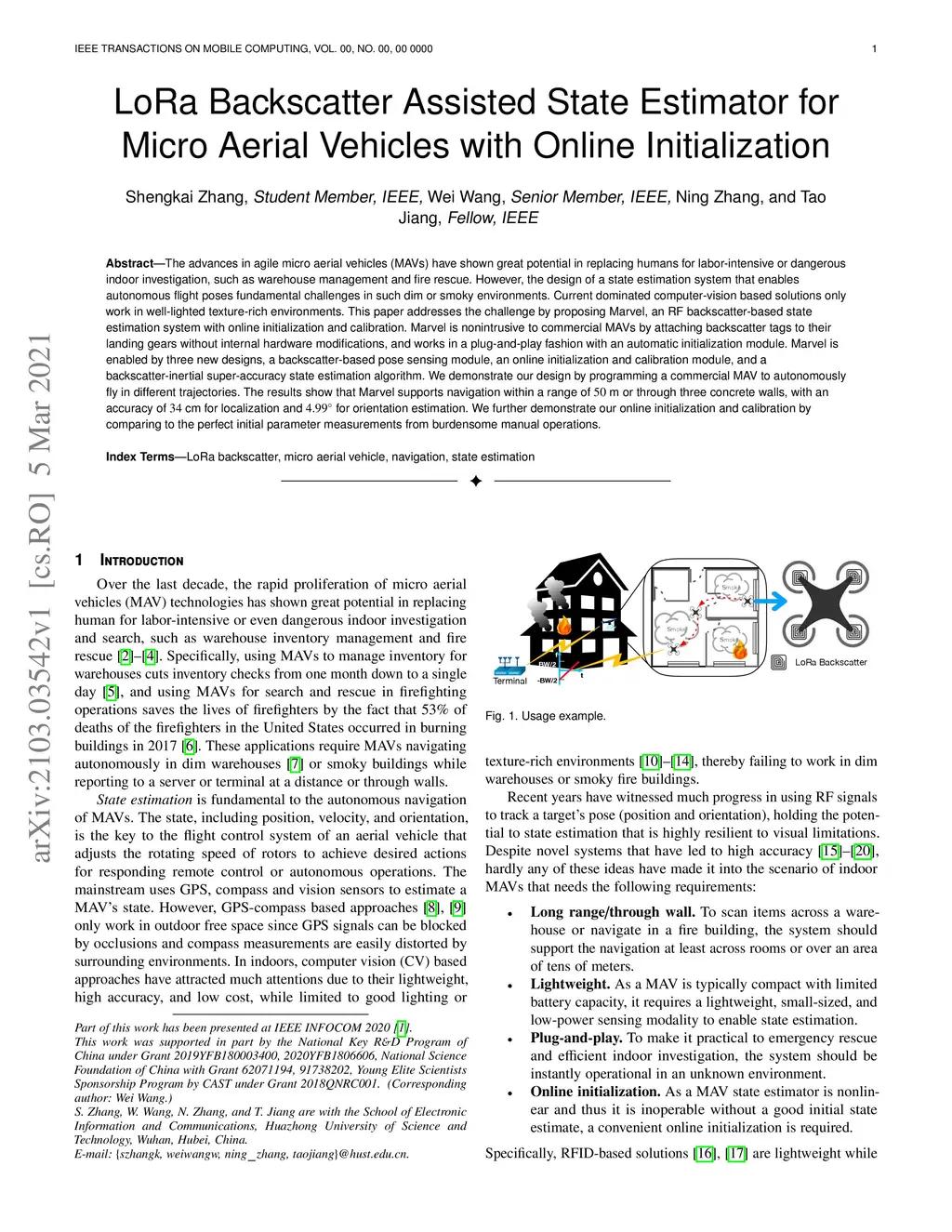 The advances in agile micro aerial vehicles (MAVs) have shown great potential in replacing humans for labor-intensive or dangerous indoor investigation, such as warehouse management and fire rescue. However, the design of a state estimation system that enables autonomous flight poses fundamental challenges in such dim or smoky environments. Current dominated computer-vision based solutions only work in well-lighted texture-rich environments. This paper addresses the challenge by proposing Marvel, an RF backscatter-based state estimation system with online initialization and calibration. Marvel is nonintrusive to commercial MAVs by attaching backscatter tags to their landing gears without internal hardware modifications, and works in a plug-and-play fashion with an automatic initialization module. Marvel is enabled by three new designs, a backscatter-based pose sensing module, an online initialization and calibration module, and a backscatter-inertial super-accuracy state estimation algorithm. We demonstrate our design by programming a commercial MAV to autonomously fly in different trajectories. The results show that Marvel supports navigation within a range of 50 m or through three concrete walls, with an accuracy of 34 cm for localization and 4.99 degrees for orientation estimation. We further demonstrate our online initialization and calibration by comparing to the perfect initial parameter measurements from burdensome manual operations.