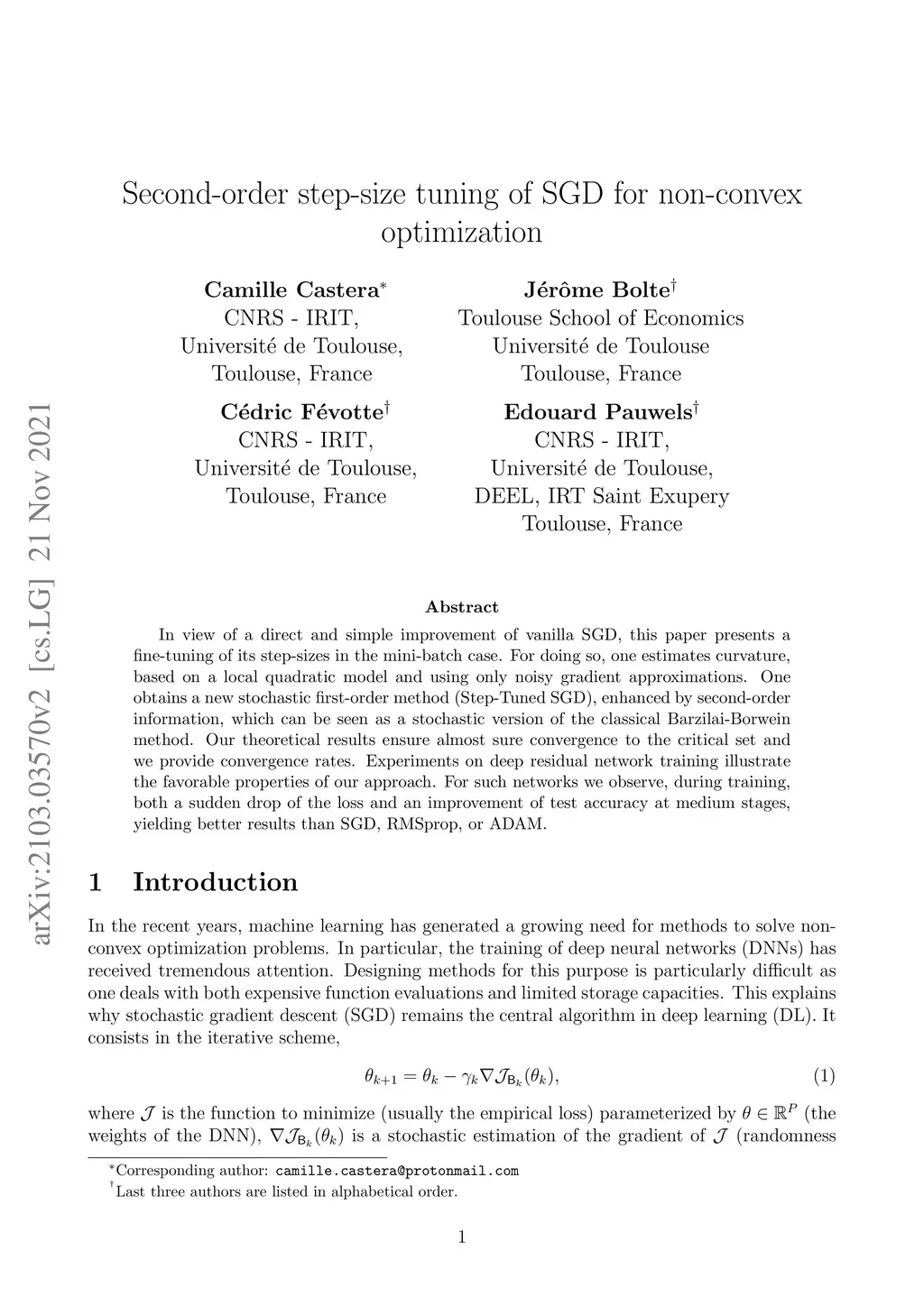 In view of a direct and simple improvement of vanilla SGD, this paper presents a fine-tuning of its step-sizes in the mini-batch case. For doing so, one estimates curvature, based on a local quadratic model and using only noisy gradient approximations. One obtains a new stochastic first-order method (Step-Tuned SGD), enhanced by second-order information, which can be seen as a stochastic version of the classical Barzilai-Borwein method. Our theoretical results ensure almost sure convergence to the critical set and we provide convergence rates. Experiments on deep residual network training illustrate the favorable properties of our approach. For such networks we observe, during training, both a sudden drop of the loss and an improvement of test accuracy at medium stages, yielding better results than SGD, RMSprop, or ADAM.