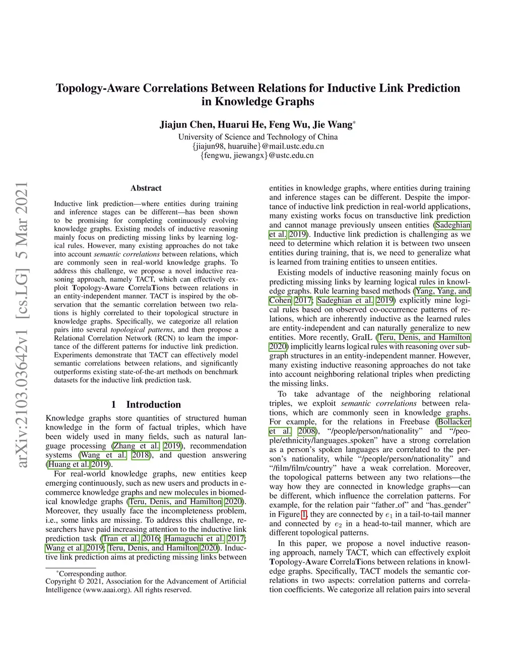 Inductive link prediction -- where entities during training and inference stages can be different -- has been shown to be promising for completing continuously evolving knowledge graphs. Existing models of inductive reasoning mainly focus on predicting missing links by learning logical rules. However, many existing approaches do not take into account semantic correlations between relations, which are commonly seen in real-world knowledge graphs. To address this challenge, we propose a novel inductive reasoning approach, namely TACT, which can effectively exploit Topology-Aware CorrelaTions between relations in an entity-independent manner. TACT is inspired by the observation that the semantic correlation between two relations is highly correlated to their topological structure in knowledge graphs. Specifically, we categorize all relation pairs into several topological patterns, and then propose a Relational Correlation Network (RCN) to learn the importance of the different patterns for inductive link prediction. Experiments demonstrate that TACT can effectively model semantic correlations between relations, and significantly outperforms existing state-of-the-art methods on benchmark datasets for the inductive link prediction task.