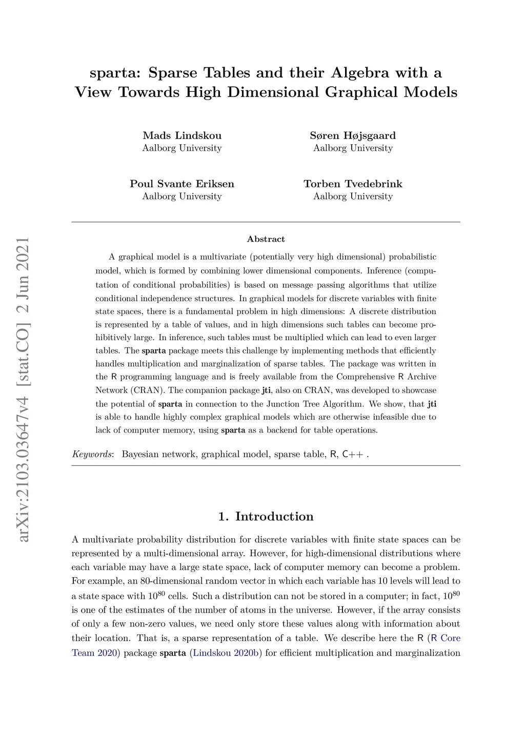A graphical model is a multivariate (potentially very high dimensional) probabilistic model, which is formed by combining lower dimensional components. Inference (computation of conditional probabilities) is based on message passing algorithms that utilize conditional independence structures. In graphical models for discrete variables with finite state spaces, there is a fundamental problem in high dimensions: A discrete distribution is represented by a table of values, and in high dimensions such tables can become prohibitively large. In inference, such tables must be multiplied which can lead to even larger tables. The sparta package meets this challenge by implementing methods that efficiently handles multiplication and marginalization of sparse tables. The package was written in the R programming language and is freely available from the Comprehensive R Archive Network (CRAN). The companion package jti, also on CRAN, was developed to showcase the potential of sparta in connection to the Junction Tree Algorithm. We show, that jti is able to handle highly complex graphical models which are otherwise infeasible due to lack of computer memory, using sparta as a backend for table operations.