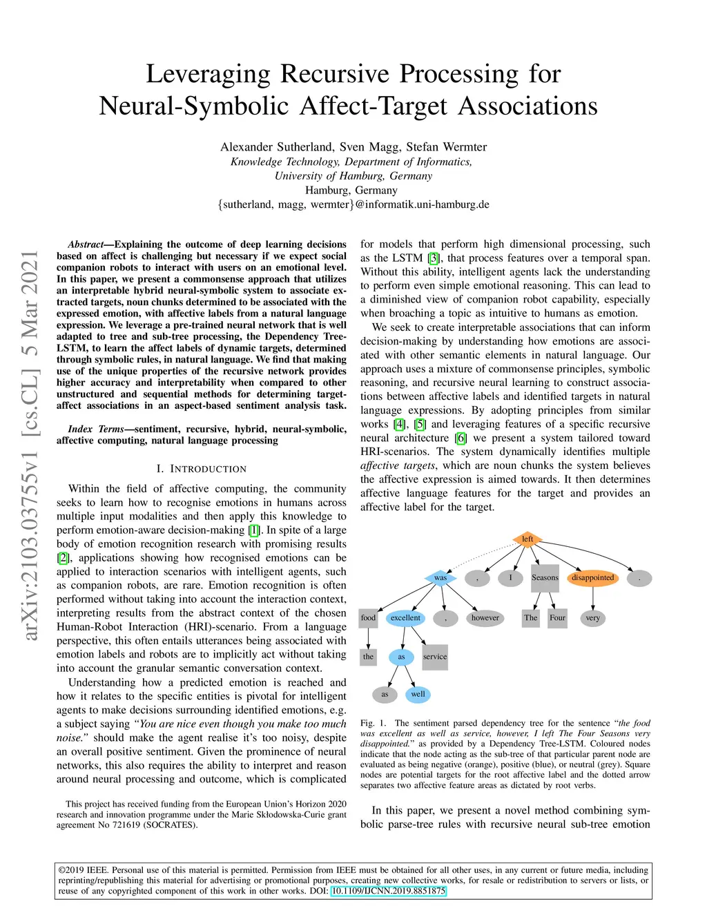 Explaining the outcome of deep learning decisions based on affect is challenging but necessary if we expect social companion robots to interact with users on an emotional level. In this paper, we present a commonsense approach that utilizes an interpretable hybrid neural-symbolic system to associate extracted targets, noun chunks determined to be associated with the expressed emotion, with affective labels from a natural language expression. We leverage a pre-trained neural network that is well adapted to tree and sub-tree processing, the Dependency Tree-LSTM, to learn the affect labels of dynamic targets, determined through symbolic rules, in natural language. We find that making use of the unique properties of the recursive network provides higher accuracy and interpretability when compared to other unstructured and sequential methods for determining target-affect associations in an aspect-based sentiment analysis task.
