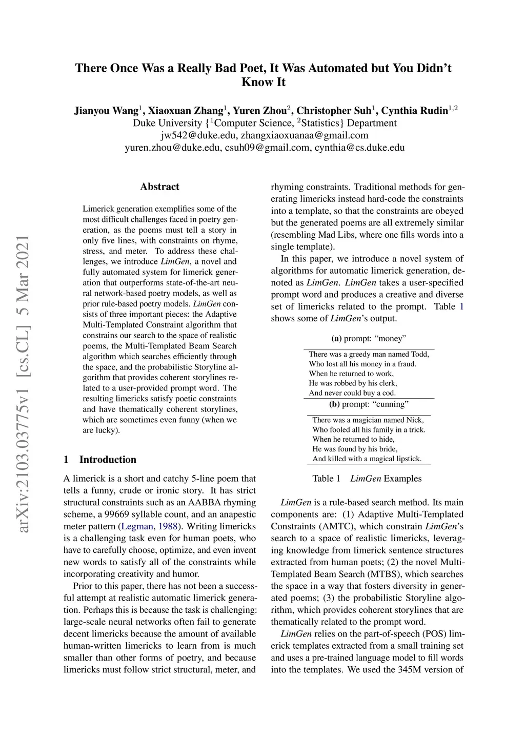 Limerick generation exemplifies some of the most difficult challenges faced in poetry generation, as the poems must tell a story in only five lines, with constraints on rhyme, stress, and meter. To address these challenges, we introduce LimGen, a novel and fully automated system for limerick generation that outperforms state-of-the-art neural network-based poetry models, as well as prior rule-based poetry models. LimGen consists of three important pieces: the Adaptive Multi-Templated Constraint algorithm that constrains our search to the space of realistic poems, the Multi-Templated Beam Search algorithm which searches efficiently through the space, and the probabilistic Storyline algorithm that provides coherent storylines related to a user-provided prompt word. The resulting limericks satisfy poetic constraints and have thematically coherent storylines, which are sometimes even funny (when we are lucky).