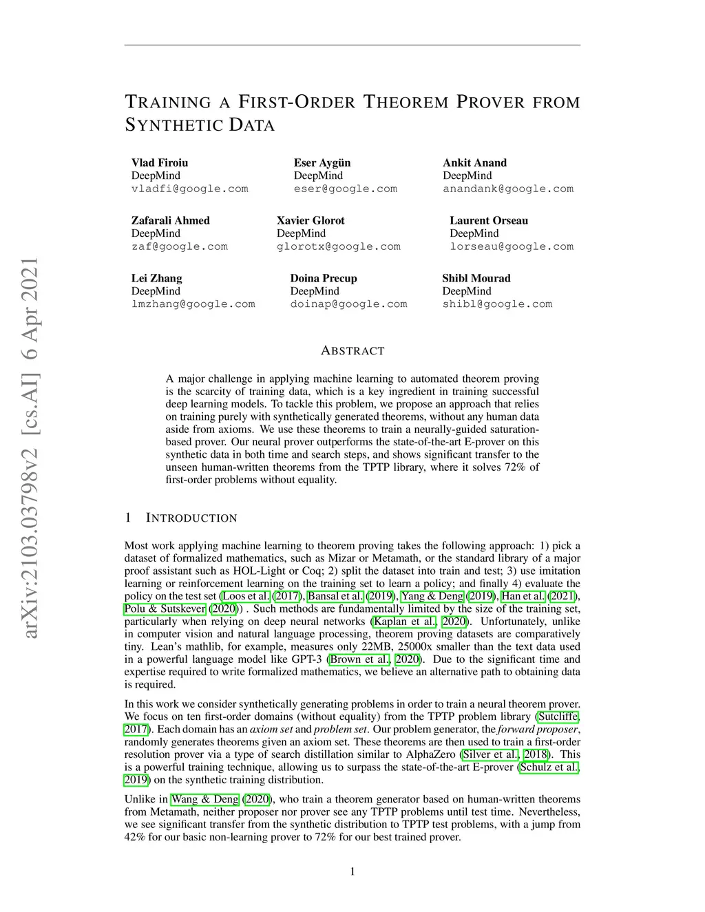 Training a First-Order Theorem Prover from Synthetic Data