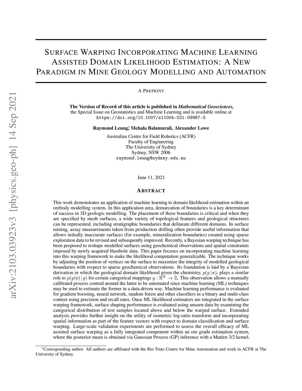 This paper illustrates an application of machine learning (ML) within a complex system that performs grade estimation. In surface mining, assay measurements taken from production drilling often provide useful information that allows initially inaccurate surfaces created using sparse exploration data to be revised and subsequently improved. Recently, a Bayesian warping technique has been proposed to reshape modeled surfaces using geochemical and spatial constraints imposed by newly acquired blasthole data. This paper focuses on incorporating machine learning into this warping framework to make the likelihood computation generalizable. The technique works by adjusting the position of vertices on the surface to maximize the integrity of modeled geological boundaries with respect to sparse geochemical observations. Its foundation is laid by a Bayesian derivation in which the geological domain likelihood given the chemistry, p(g|c), plays a similar role to p(y(c)|g). This observation allows a manually calibrated process centered around the latter to be automated since ML techniques may be used to estimate the former in a data-driven way. Machine learning performance is evaluated for gradient boosting, neural network, random forest and other classifiers in a binary and multi-class context using precision and recall rates. Once ML likelihood estimators are integrated in the surface warping framework, surface shaping performance is evaluated using unseen data by examining the categorical distribution of test samples located above and below the warped surface. Large-scale validation experiments are performed to assess the overall efficacy of ML assisted surface warping as a fully integrated component within an ore grade estimation system where the posterior mean is obtained via Gaussian Process inference with a Matern 3/2 kernel.