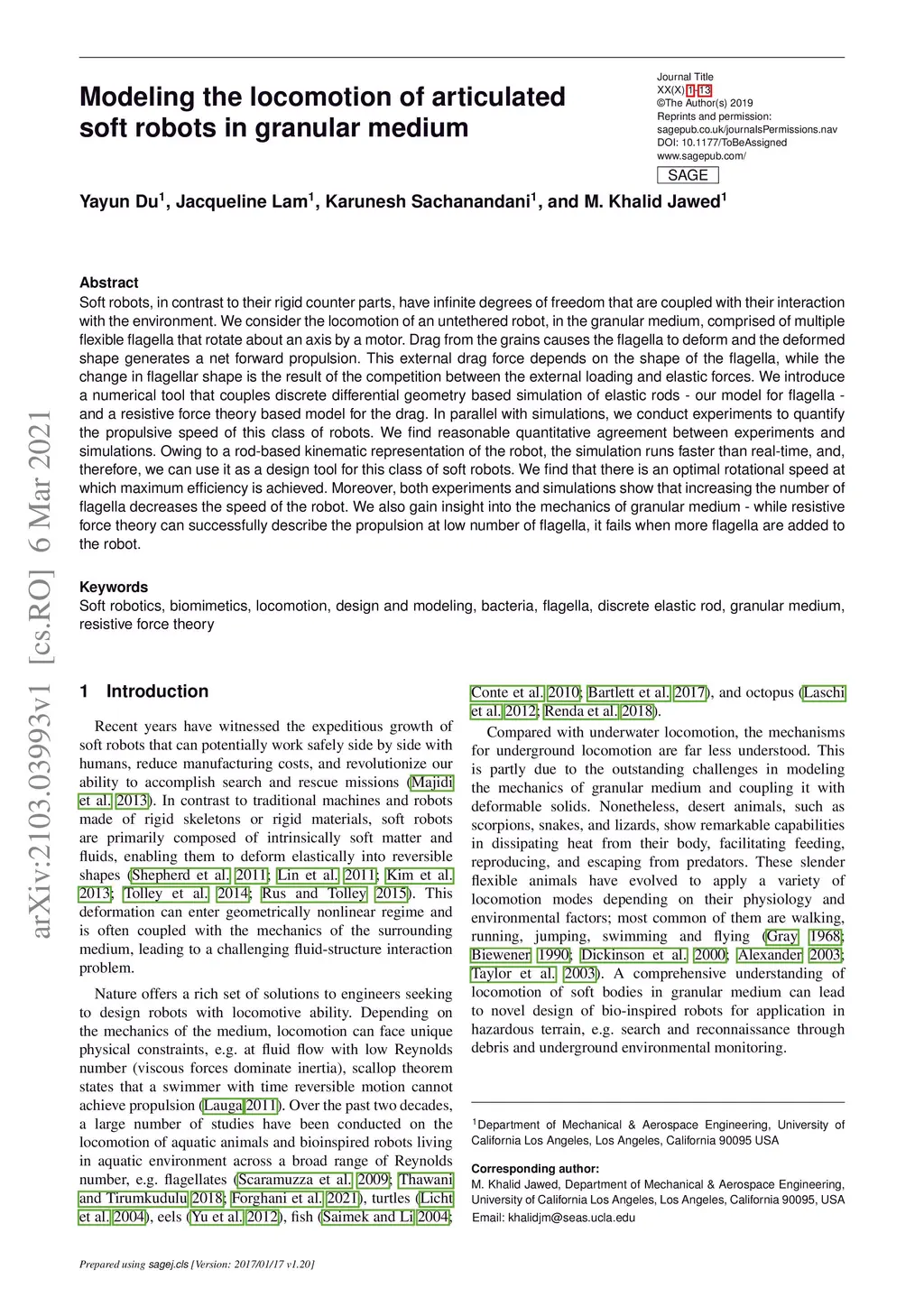 Soft robots, in contrast to their rigid counter parts, have infinite degrees of freedom that are coupled with their interaction with the environment. We consider the locomotion of an untethered robot, in the granular medium, comprised of multiple flexible flagella that rotate about an axis by a motor. Drag from the grains causes the flagella to deform and the deformed shape generates a net forward propulsion. This external drag force depends on the shape of the flagella, while the change in flagellar shape is the result of the competition between the external loading and elastic forces. We introduce a numerical tool that couples discrete differential geometry based simulation of elastic rods - our model for flagella - and a resistive force theory based model for the drag. In parallel with simulations, we conduct experiments to quantify the propulsive speed of this class of robots. We find reasonable quantitative agreement between experiments and simulations. Owing to a rod-based kinematic representation of the robot, the simulation runs faster than real-time, and, therefore, we can use it as a design tool for this class of soft robots. We find that there is an optimal rotational speed at which maximum efficiency is achieved. Moreover, both experiments and simulations show that increasing the number of flagella decreases the speed of the robot. We also gain insight into the mechanics of granular medium - while resistive force theory can successfully describe the propulsion at low number of flagella, it fails when more flagella are added to the robot.