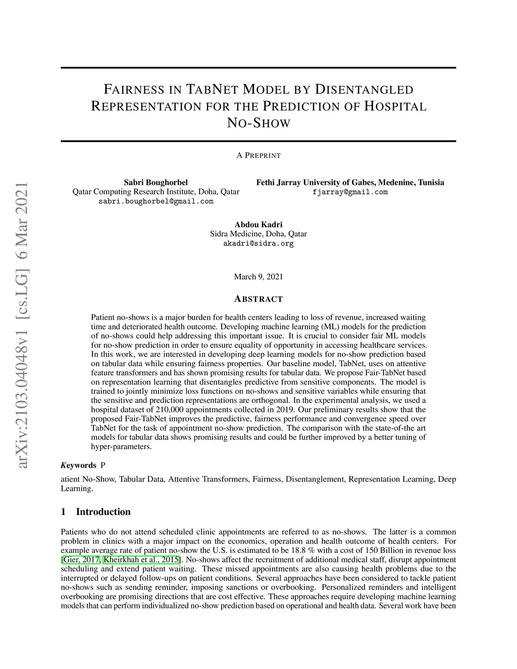 Patient no-shows is a major burden for health centers leading to loss of revenue, increased waiting time and deteriorated health outcome. Developing machine learning (ML) models for the prediction of no -shows could help addressing this important issue. It is crucial to consider fair ML models for no-show prediction in order to ensure equality of opportunity in accessing healthcare services. In this wo rk, we are interested in developing deep learning models for no-show prediction based on tabular data while ensuring fairness properties. Our baseline model, TabNet, uses on attentive feature transforme rs and has shown promising results for tabular data. We propose Fair-TabNet based on representation learning that disentangles predictive from sensitive components. The model is trained to jointly min imize loss functions on no-shows and sensitive variables while ensuring that the sensitive and prediction representations are orthogonal. In the experimental analysis, we used a hospital dataset of 210, 000 appointments collected in 2019. Our preliminary results show that the proposed Fair-TabNet improves the predictive, fairness performance and convergence speed over TabNet for the task of appointment no-show prediction. The comparison with the state-of-the art models for tabular data shows promising results and could be further improved by a better tuning of hyper-parameters.