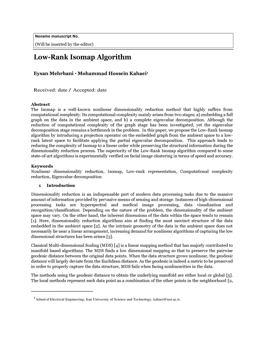 The Isomap is a well-known nonlinear dimensionality reduction method that highly suffers from computational complexity. Its computational complexity mainly arises from two stages; a) embedding a full graph on the data in the ambient space, and b) a complete eigenvalue decomposition. Although the reduction of the computational complexity of the graphing stage has been investigated, yet the eigenvalue decomposition stage remains a bottleneck in the problem. In this paper, we propose the Low-Rank Isomap algorithm by introducing a projection operator on the embedded graph from the ambient space to a low-rank latent space to facilitate applying the partial eigenvalue decomposition. This approach leads to reducing the complexity of Isomap to a linear order while preserving the structural information during the dimensionality reduction process. The superiority of the Low-Rank Isomap algorithm compared to some state-of-art algorithms is experimentally verified on facial image clustering in terms of speed and accuracy.