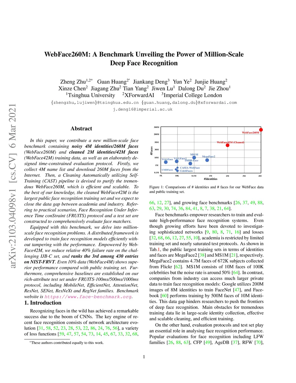 In this paper, we contribute a new million-scale face benchmark containing noisy 4M identities/260M faces (WebFace260M) and cleaned 2M identities/42M faces (WebFace42M) training data, as well as an elaborately designed time-constrained evaluation protocol. Firstly, we collect 4M name list and download 260M faces from the Internet. Then, a Cleaning Automatically utilizing Self-Training (CAST) pipeline is devised to purify the tremendous WebFace260M, which is efficient and scalable. To the best of our knowledge, the cleaned WebFace42M is the largest public face recognition training set and we expect to close the data gap between academia and industry. Referring to practical scenarios, Face Recognition Under Inference Time conStraint (FRUITS) protocol and a test set are constructed to comprehensively evaluate face matchers. Equipped with this benchmark, we delve into million-scale face recognition problems. A distributed framework is developed to train face recognition models efficiently without tampering with the performance. Empowered by WebFace42M, we reduce relative 40% failure rate on the challenging IJB-C set, and ranks the 3rd among 430 entries on NIST-FRVT. Even 10% data (WebFace4M) shows superior performance compared with public training set. Furthermore, comprehensive baselines are established on our rich-attribute test set under FRUITS-100ms/500ms/1000ms protocol, including MobileNet, EfficientNet, AttentionNet, ResNet, SENet, ResNeXt and RegNet families. Benchmark website is https://www.face-benchmark.org.