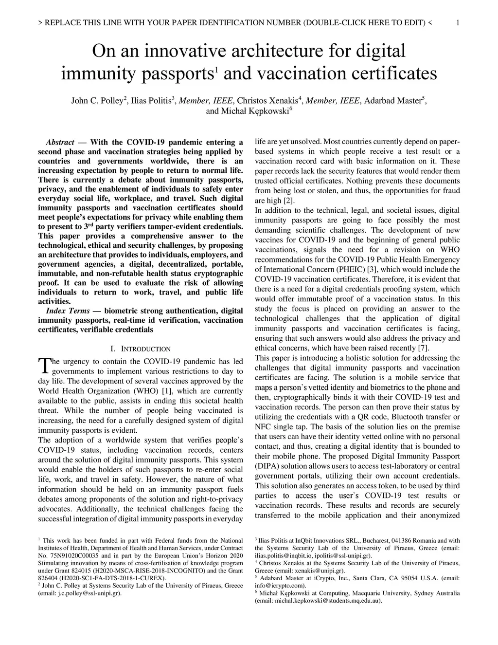 On an innovative architecture for digital immunity passports and vaccination certificates