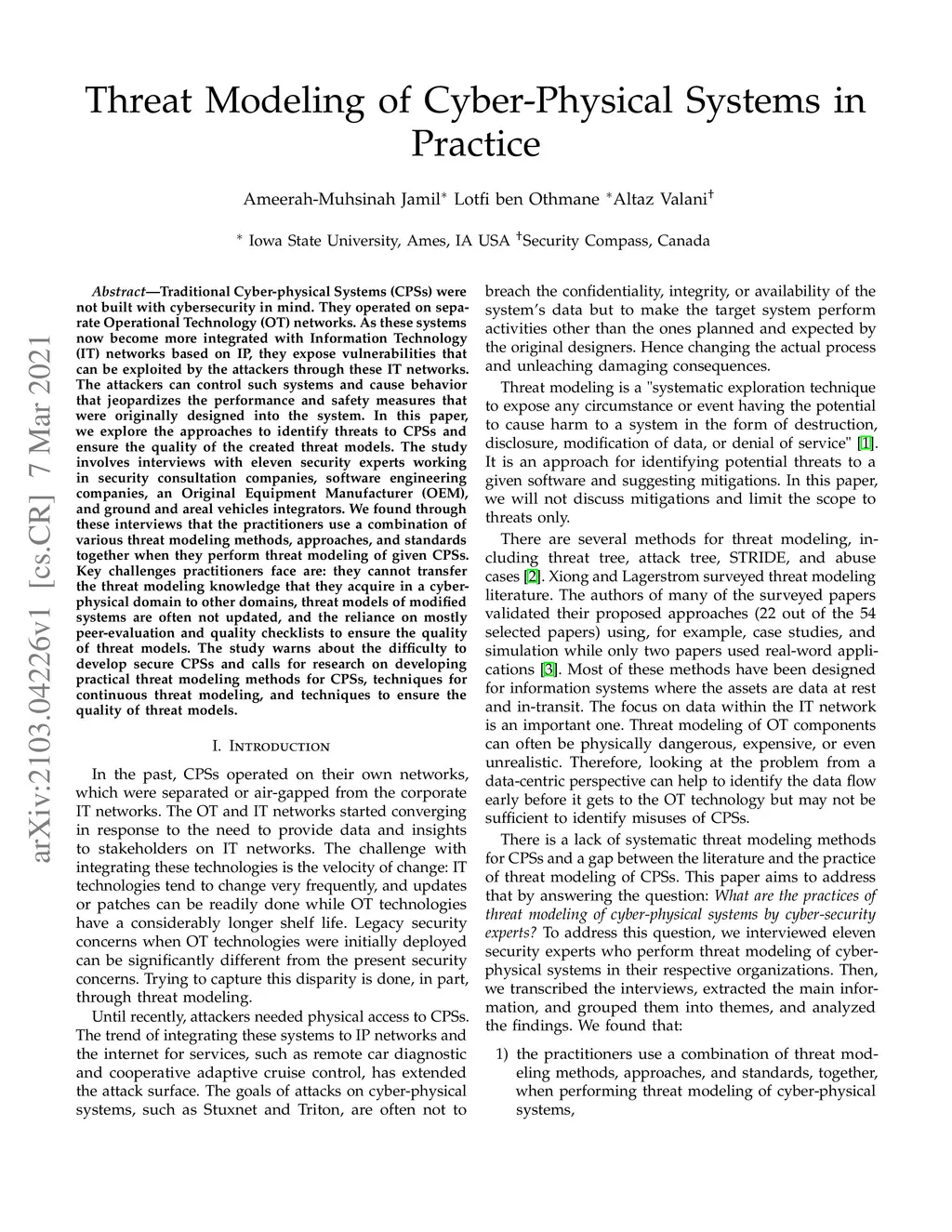 Traditional Cyber-physical Systems(CPSs) were not built with cybersecurity in mind. They operated on separate Operational Technology (OT) networks. As these systems now become more integrated with Information Technology (IT) networks based on IP, they expose vulnerabilities that can be exploited by the attackers through these IT networks. The attackers can control such systems and cause behavior that jeopardizes the performance and safety measures that were originally designed into the system. In this paper, we explore the approaches to identify threats to CPSs and ensure the quality of the created threat models. The study involves interviews with eleven security experts working in security consultation companies, software engineering companies, an Original Equipment Manufacturer (OEM),and ground and areal vehicles integrators. We found through these interviews that the practitioners use a combination of various threat modeling methods, approaches, and standards together when they perform threat modeling of given CPSs. key challenges practitioners face are: they cannot transfer the threat modeling knowledge that they acquire in a cyber-physical domain to other domains, threat models of modified systems are often not updated, and the reliance on mostly peer-evaluation and quality checklists to ensure the quality of threat models. The study warns about the difficulty to develop secure CPSs and calls for research on developing practical threat modeling methods for CPSs, techniques for continuous threat modeling, and techniques to ensure the quality of threat models.