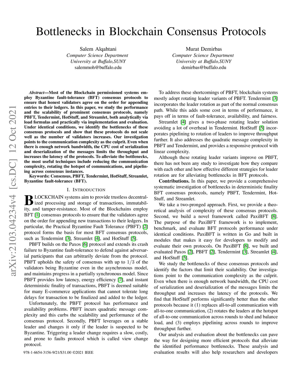 Most of the Blockchain permissioned systems employ Byzantine fault-tolerance (BFT) consensus protocols to ensure that honest validators agree on the order for appending entries to their ledgers. In this paper, we study the performance and the scalability of prominent consensus protocols, namely PBFT, Tendermint, HotStuff, and Streamlet, both analytically via load formulas and practically via implementation and evaluation. Under identical conditions, we identify the bottlenecks of these consensus protocols and show that these protocols do not scale well as the number of validators increases. Our investigation points to the communication complexity as the culprit. Even when there is enough network bandwidth, the CPU cost of serialization and deserialization of the messages limits the throughput and increases the latency of the protocols. To alleviate the bottlenecks, the most useful techniques include reducing the communication complexity, rotating the hotspot of communications, and pipelining across consensus instances.