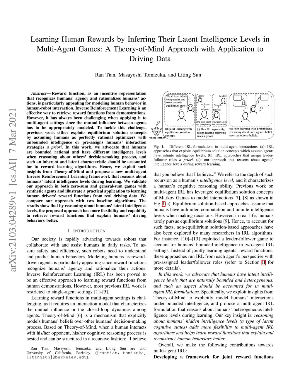 Reward function, as an incentive representation that recognizes humans' agency and rationalizes humans' actions, is particularly appealing for modeling human behavior in human-robot interaction. Inverse Reinforcement Learning is an effective way to retrieve reward functions from demonstrations. However, it has always been challenging when applying it to multi-agent settings since the mutual influence between agents has to be appropriately modeled. To tackle this challenge, previous work either exploits equilibrium solution concepts by assuming humans as perfectly rational optimizers with unbounded intelligence or pre-assigns humans' interaction strategies a priori. In this work, we advocate that humans are bounded rational and have different intelligence levels when reasoning about others' decision-making process, and such an inherent and latent characteristic should be accounted for in reward learning algorithms. Hence, we exploit such insights from Theory-of-Mind and propose a new multi-agent Inverse Reinforcement Learning framework that reasons about humans' latent intelligence levels during learning. We validate our approach in both zero-sum and general-sum games with synthetic agents and illustrate a practical application to learning human drivers' reward functions from real driving data. We compare our approach with two baseline algorithms. The results show that by reasoning about humans' latent intelligence levels, the proposed approach has more flexibility and capability to retrieve reward functions that explain humans' driving behaviors better.