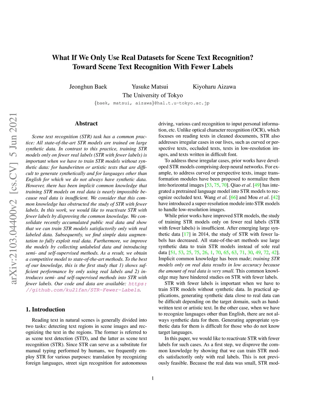 Scene text recognition (STR) task has a common practice: All state-of-the-art STR models are trained on large synthetic data. In contrast to this practice, training STR models only on fewer real labels (STR with fewer labels) is important when we have to train STR models without synthetic data: for handwritten or artistic texts that are difficult to generate synthetically and for languages other than English for which we do not always have synthetic data. However, there has been implicit common knowledge that training STR models on real data is nearly impossible because real data is insufficient. We consider that this common knowledge has obstructed the study of STR with fewer labels. In this work, we would like to reactivate STR with fewer labels by disproving the common knowledge. We consolidate recently accumulated public real data and show that we can train STR models satisfactorily only with real labeled data. Subsequently, we find simple data augmentation to fully exploit real data. Furthermore, we improve the models by collecting unlabeled data and introducing semi- and self-supervised methods. As a result, we obtain a competitive model to state-of-the-art methods. To the best of our knowledge, this is the first study that 1) shows sufficient performance by only using real labels and 2) introduces semi- and self-supervised methods into STR with fewer labels. Our code and data are available: https://github.com/ku21fan/STR-Fewer-Labels
