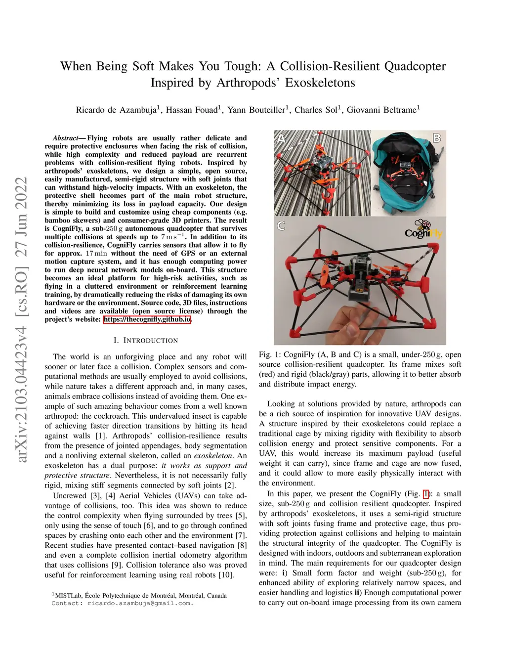 Flying robots are usually rather delicate and require protective enclosures when facing the risk of collision, while high complexity and reduced payload are recurrent problems with collision-resilient flying robots. Inspired by arthropods' exoskeletons, we design a simple, open source, easily manufactured, semi-rigid structure with soft joints that can withstand high-velocity impacts. With an exoskeleton, the protective shell becomes part of the main robot structure, thereby minimizing its loss in payload capacity. Our design is simple to build and customize using cheap components (e.g. bamboo skewers) and consumer-grade 3D printers. The result is CogniFly, a sub-250g autonomous quadcopter that survives multiple collisions at speeds up to 7m/s. In addition to its collision-resiliency, CogniFly is easy to program using Python or Buzz, carries sensors that allow it to fly for approx. 17min without the need of GPS or an external motion capture system, has enough computing power to run deep neural network models on-board and was designed to facilitate integration with an automated battery swapping system. This structure becomes an ideal platform for high-risk activities (such as flying in a cluttered environment or reinforcement learning training) by dramatically reducing the risks of damaging its own hardware or the environment. Source code, 3D files, instructions and videos are available through the project's website (https://thecognifly.github.io).