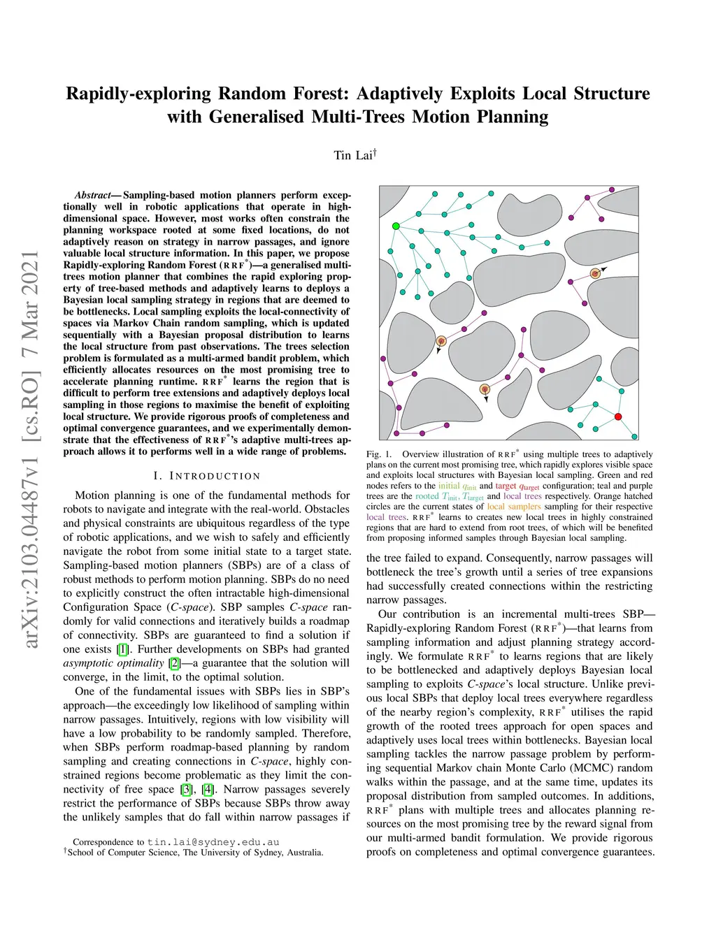 Sampling-based motion planners perform exceptionally well in robotic applications that operate in high-dimensional space. However, most works often constrain the planning workspace rooted at some fixed locations, do not adaptively reason on strategy in narrow passages, and ignore valuable local structure information. In this paper, we propose Rapidly-exploring Random Forest (RRF*) -- a generalised multi-trees motion planner that combines the rapid exploring property of tree-based methods and adaptively learns to deploys a Bayesian local sampling strategy in regions that are deemed to be bottlenecks. Local sampling exploits the local-connectivity of spaces via Markov Chain random sampling, which is updated sequentially with a Bayesian proposal distribution to learns the local structure from past observations. The trees selection problem is formulated as a multi-armed bandit problem, which efficiently allocates resources on the most promising tree to accelerate planning runtime. RRF* learns the region that is difficult to perform tree extensions and adaptively deploys local sampling in those regions to maximise the benefit of exploiting local structure. We provide rigorous proofs of completeness and optimal convergence guarantees, and we experimentally demonstrate that the effectiveness of RRF*'s adaptive multi-trees approach allows it to performs well in a wide range of problems.