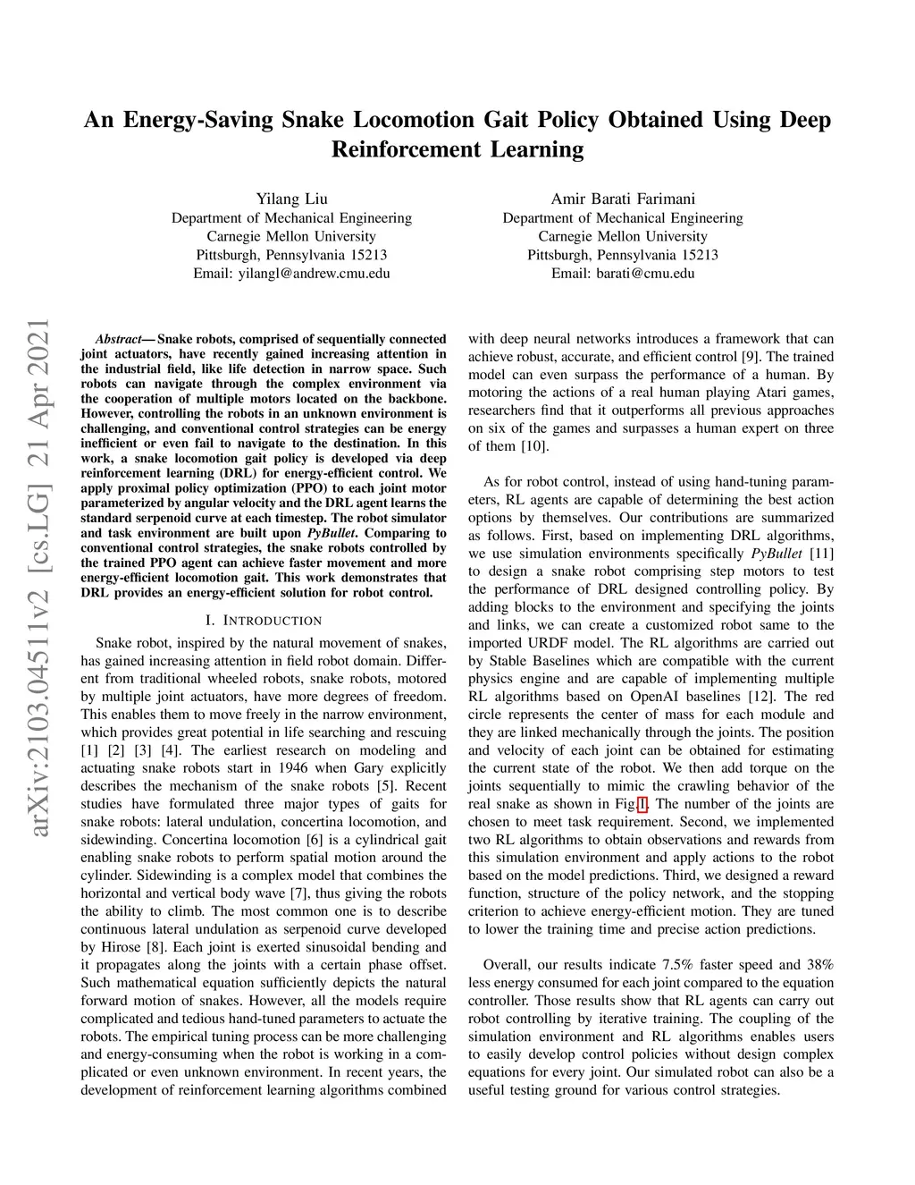 An Energy-Saving Snake Locomotion Gait Policy Using Deep Reinforcement