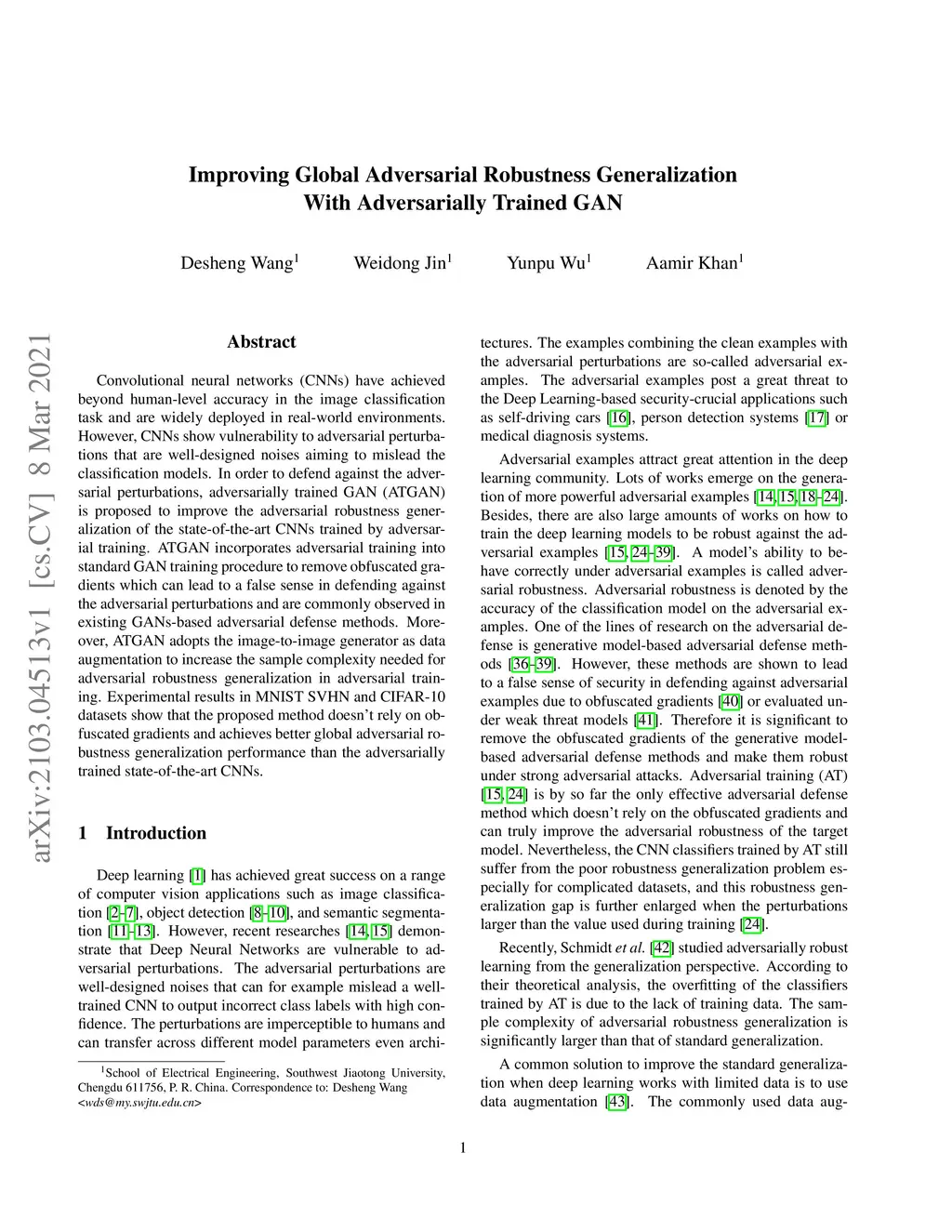 Convolutional neural networks (CNNs) have achieved beyond human-level accuracy in the image classification task and are widely deployed in real-world environments. However, CNNs show vulnerability to adversarial perturbations that are well-designed noises aiming to mislead the classification models. In order to defend against the adversarial perturbations, adversarially trained GAN (ATGAN) is proposed to improve the adversarial robustness generalization of the state-of-the-art CNNs trained by adversarial training. ATGAN incorporates adversarial training into standard GAN training procedure to remove obfuscated gradients which can lead to a false sense in defending against the adversarial perturbations and are commonly observed in existing GANs-based adversarial defense methods. Moreover, ATGAN adopts the image-to-image generator as data augmentation to increase the sample complexity needed for adversarial robustness generalization in adversarial training. Experimental results in MNIST SVHN and CIFAR-10 datasets show that the proposed method doesn't rely on obfuscated gradients and achieves better global adversarial robustness generalization performance than the adversarially trained state-of-the-art CNNs.