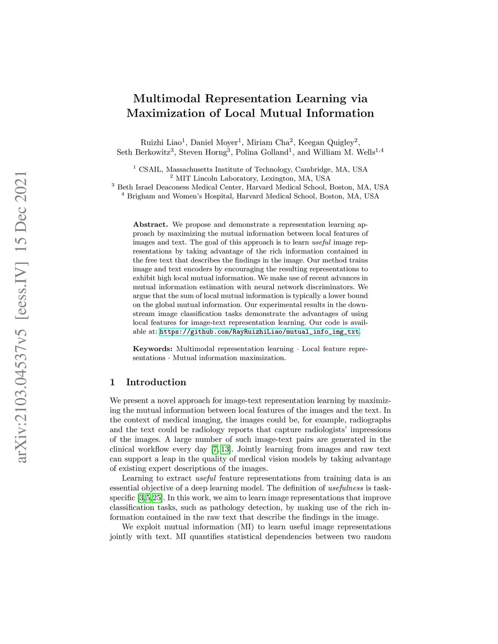 We propose and demonstrate a representation learning approach by maximizing the mutual information between local features of images and text. The goal of this approach is to learn useful image representations by taking advantage of the rich information contained in the free text that describes the findings in the image. Our method trains image and text encoders by encouraging the resulting representations to exhibit high local mutual information. We make use of recent advances in mutual information estimation with neural network discriminators. We argue that the sum of local mutual information is typically a lower bound on the global mutual information. Our experimental results in the downstream image classification tasks demonstrate the advantages of using local features for image-text representation learning.