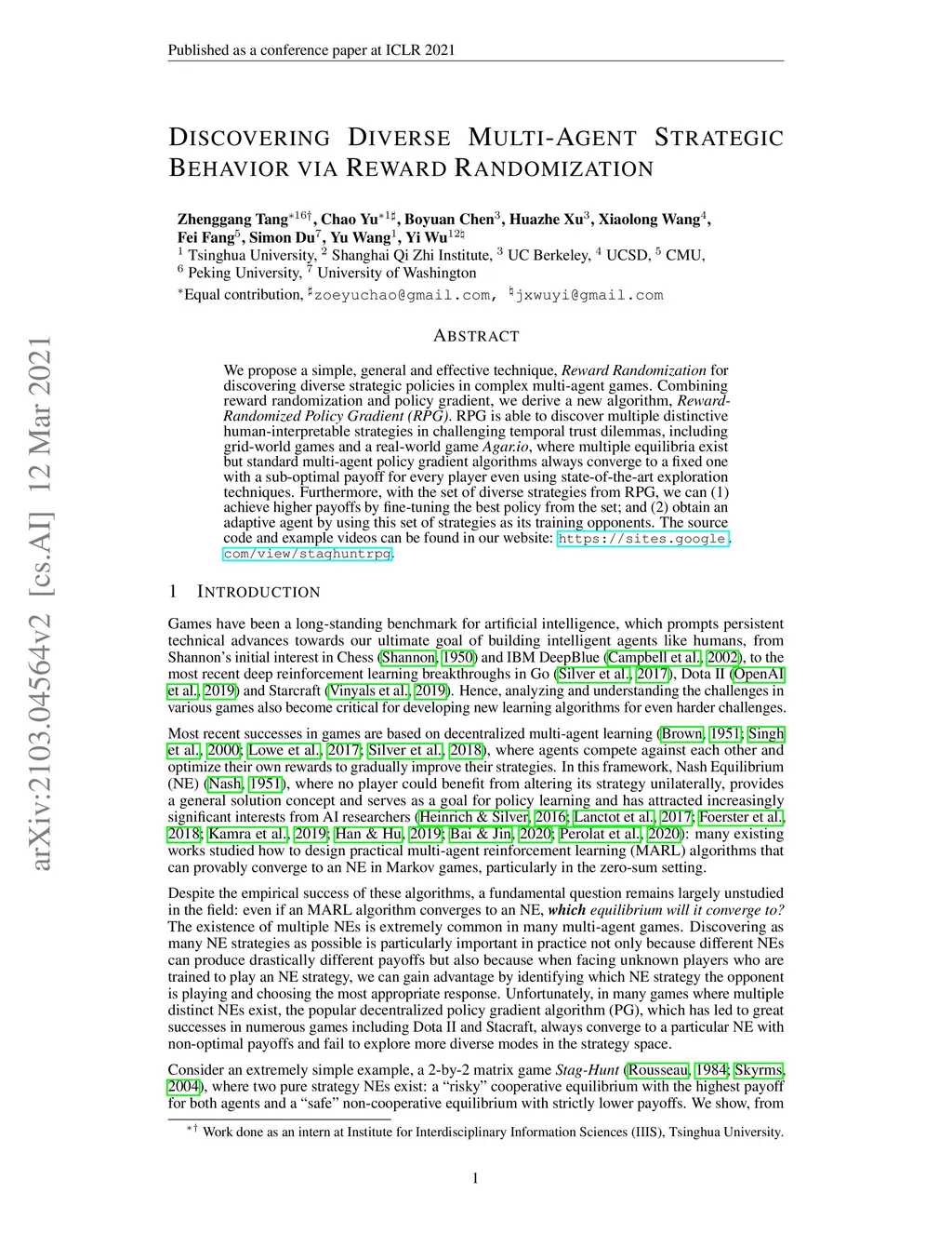 We propose a simple, general and effective technique, Reward Randomization for discovering diverse strategic policies in complex multi-agent games. Combining reward randomization and policy gradient, we derive a new algorithm, Reward-Randomized Policy Gradient (RPG). RPG is able to discover multiple distinctive human-interpretable strategies in challenging temporal trust dilemmas, including grid-world games and a real-world game Agar.io, where multiple equilibria exist but standard multi-agent policy gradient algorithms always converge to a fixed one with a sub-optimal payoff for every player even using state-of-the-art exploration techniques. Furthermore, with the set of diverse strategies from RPG, we can (1) achieve higher payoffs by fine-tuning the best policy from the set; and (2) obtain an adaptive agent by using this set of strategies as its training opponents. The source code and example videos can be found in our website: https://sites.google.com/view/staghuntrpg.