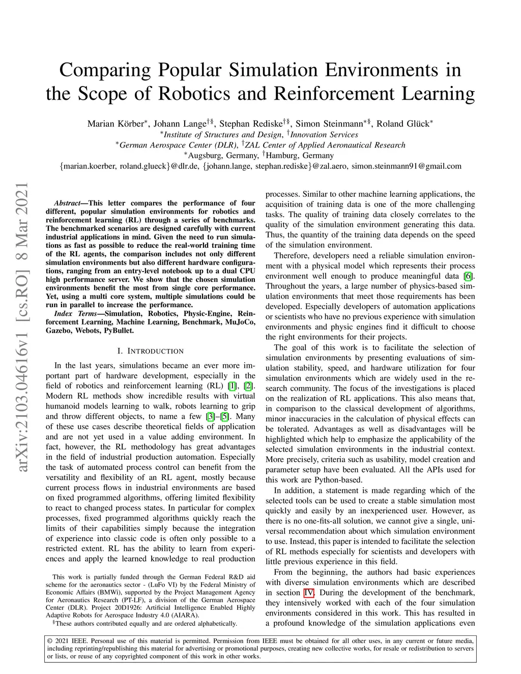 This letter compares the performance of four different, popular simulation environments for robotics and reinforcement learning (RL) through a series of benchmarks. The benchmarked scenarios are designed carefully with current industrial applications in mind. Given the need to run simulations as fast as possible to reduce the real-world training time of the RL agents, the comparison includes not only different simulation environments but also different hardware configurations, ranging from an entry-level notebook up to a dual CPU high performance server. We show that the chosen simulation environments benefit the most from single core performance. Yet, using a multi core system, multiple simulations could be run in parallel to increase the performance.