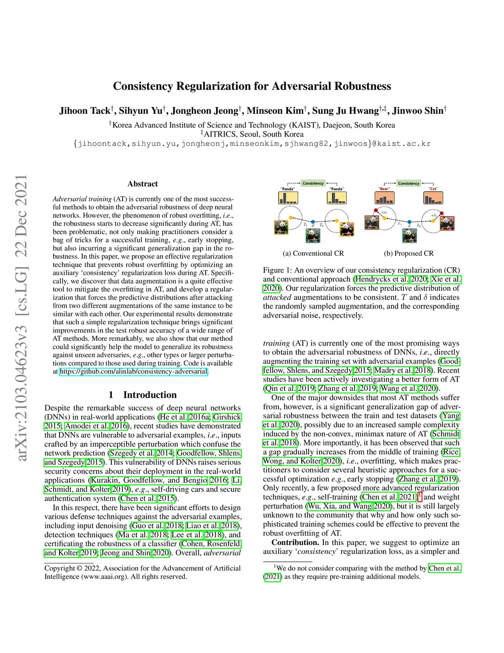 Adversarial training (AT) is currently one of the most successful methods to obtain the adversarial robustness of deep neural networks. However, the phenomenon of robust overfitting, i.e., the robustness starts to decrease significantly during AT, has been problematic, not only making practitioners consider a bag of tricks for a successful training, e.g., early stopping, but also incurring a significant generalization gap in the robustness. In this paper, we propose an effective regularization technique that prevents robust overfitting by optimizing an auxiliary `consistency' regularization loss during AT. Specifically, we discover that data augmentation is a quite effective tool to mitigate the overfitting in AT, and develop a regularization that forces the predictive distributions after attacking from two different augmentations of the same instance to be similar with each other. Our experimental results demonstrate that such a simple regularization technique brings significant improvements in the test robust accuracy of a wide range of AT methods. More remarkably, we also show that our method could significantly help the model to generalize its robustness against unseen adversaries, e.g., other types or larger perturbations compared to those used during training. Code is available at https://github.com/alinlab/consistency-adversarial.