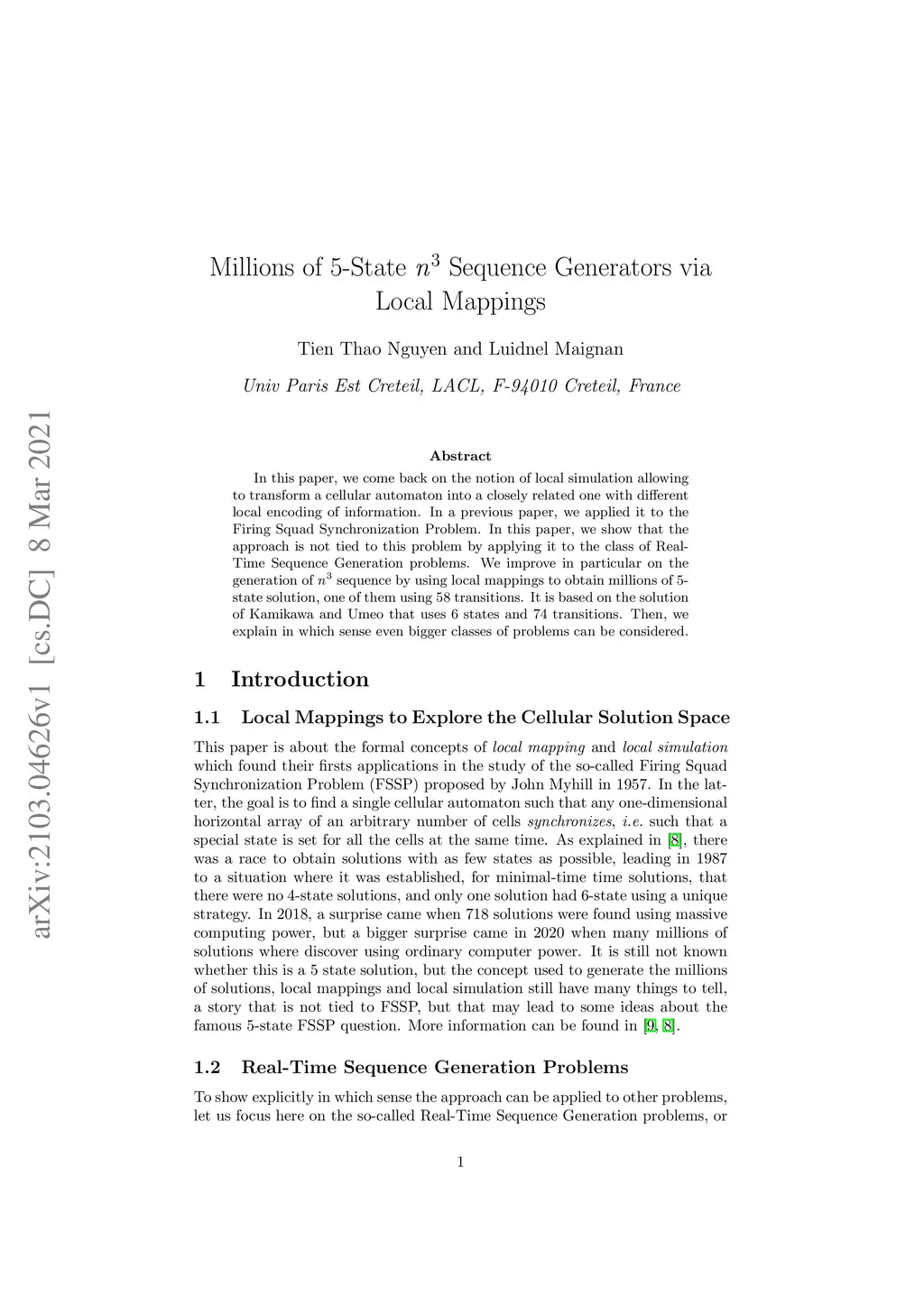 In this paper, we come back on the notion of local simulation allowing to transform a cellular automaton into a closely related one with different local encoding of information. In a previous paper, we applied it to the Firing Squad Synchronization Problem. In this paper, we show that the approach is not tied to this problem by applying it to the class of Real-Time Sequence Generation problems. We improve in particular on the generation of n 3 sequence by using local mappings to obtain millions of 5state solution, one of them using 58 transitions. It is based on the solution of Kamikawa and Umeo that uses 6 states and 74 transitions. Then, we explain in which sense even bigger classes of problems can be considered.