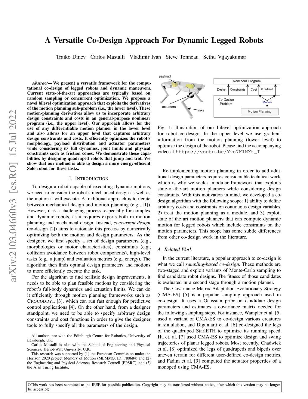 We present a versatile framework for the computational co-design of legged robots and dynamic maneuvers. Current state-of-the-art approaches are typically based on random sampling or concurrent optimization. We propose a novel bilevel optimization approach that exploits the derivatives of the motion planning sub-problem (i.e., the lower level). These motion-planning derivatives allow us to incorporate arbitrary design constraints and costs in an general-purpose nonlinear program (i.e., the upper level). Our approach allows for the use of any differentiable motion planner in the lower level and also allows for an upper level that captures arbitrary design constraints and costs. It efficiently optimizes the robot's morphology, payload distribution and actuator parameters while considering its full dynamics, joint limits and physical constraints such as friction cones. We demonstrate these capabilities by designing quadruped robots that jump and trot. We show that our method is able to design a more energy-efficient Solo robot for these tasks.