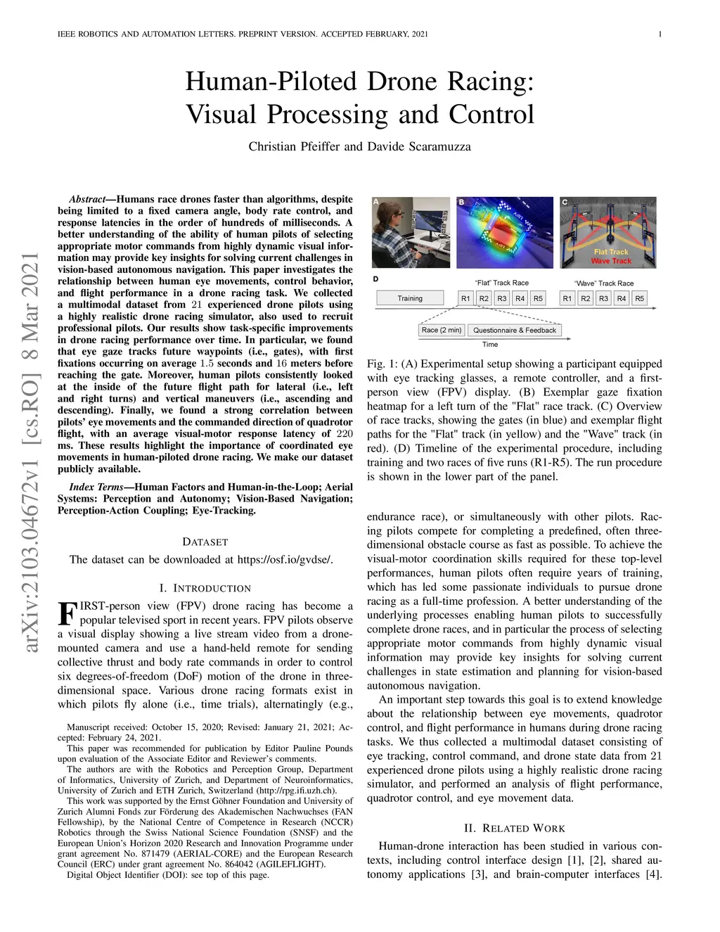 Humans race drones faster than algorithms, despite being limited to a fixed camera angle, body rate control, and response latencies in the order of hundreds of milliseconds. A better understanding of the ability of human pilots of selecting appropriate motor commands from highly dynamic visual information may provide key insights for solving current challenges in vision-based autonomous navigation. This paper investigates the relationship between human eye movements, control behavior, and flight performance in a drone racing task. We collected a multimodal dataset from 21 experienced drone pilots using a highly realistic drone racing simulator, also used to recruit professional pilots. Our results show task-specific improvements in drone racing performance over time. In particular, we found that eye gaze tracks future waypoints (i.e., gates), with first fixations occurring on average 1.5 seconds and 16 meters before reaching the gate. Moreover, human pilots consistently looked at the inside of the future flight path for lateral (i.e., left and right turns) and vertical maneuvers (i.e., ascending and descending). Finally, we found a strong correlation between pilots eye movements and the commanded direction of quadrotor flight, with an average visual-motor response latency of 220 ms. These results highlight the importance of coordinated eye movements in human-piloted drone racing. We make our dataset publicly available.
