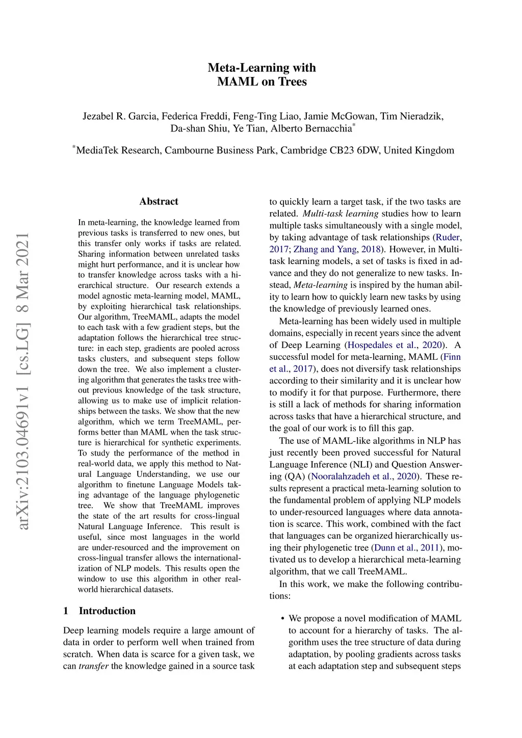 In meta-learning, the knowledge learned from previous tasks is transferred to new ones, but this transfer only works if tasks are related. Sharing information between unrelated tasks might hurt performance, and it is unclear how to transfer knowledge across tasks with a hierarchical structure. Our research extends a model agnostic meta-learning model, MAML, by exploiting hierarchical task relationships. Our algorithm, TreeMAML, adapts the model to each task with a few gradient steps, but the adaptation follows the hierarchical tree structure: in each step, gradients are pooled across tasks clusters, and subsequent steps follow down the tree. We also implement a clustering algorithm that generates the tasks tree without previous knowledge of the task structure, allowing us to make use of implicit relationships between the tasks. We show that the new algorithm, which we term TreeMAML, performs better than MAML when the task structure is hierarchical for synthetic experiments. To study the performance of the method in real-world data, we apply this method to Natural Language Understanding, we use our algorithm to finetune Language Models taking advantage of the language phylogenetic tree. We show that TreeMAML improves the state of the art results for cross-lingual Natural Language Inference. This result is useful, since most languages in the world are under-resourced and the improvement on cross-lingual transfer allows the internationalization of NLP models. This results open the window to use this algorithm in other real-world hierarchical datasets.
