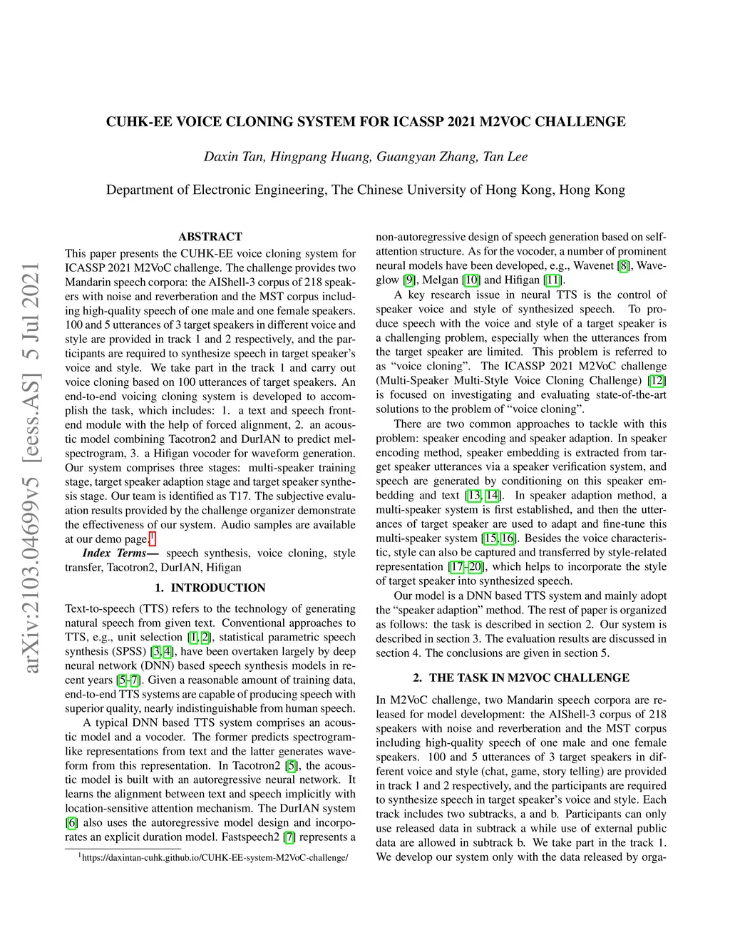CUHK-EE Voice Cloning System for ICASSP 2021 M2VoC Challenge