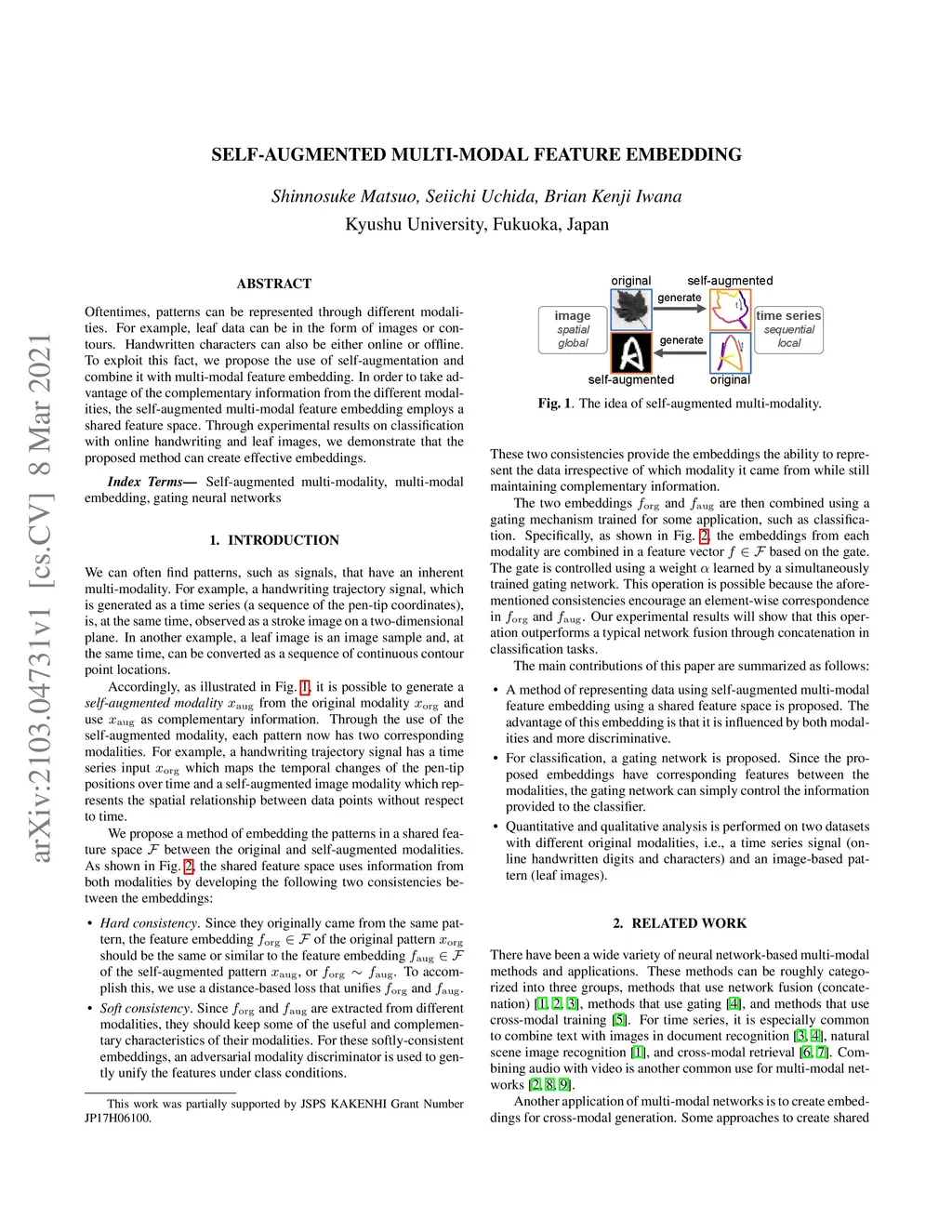 Oftentimes, patterns can be represented through different modalities. For example, leaf data can be in the form of images or contours. Handwritten characters can also be either online or offline. To exploit this fact, we propose the use of self-augmentation and combine it with multi-modal feature embedding. In order to take advantage of the complementary information from the different modalities, the self-augmented multi-modal feature embedding employs a shared feature space. Through experimental results on classification with online handwriting and leaf images, we demonstrate that the proposed method can create effective embeddings.