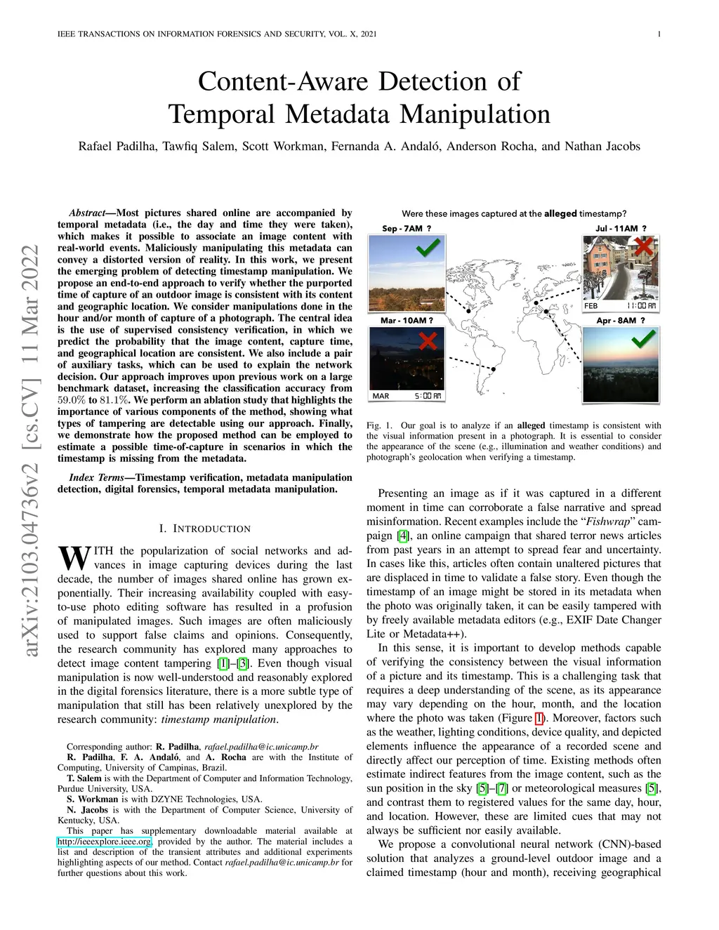 Most pictures shared online are accompanied by temporal metadata (i.e., the day and time they were taken), which makes it possible to associate an image content with real-world events. Maliciously manipulating this metadata can convey a distorted version of reality. In this work, we present the emerging problem of detecting timestamp manipulation. We propose an end-to-end approach to verify whether the purported time of capture of an outdoor image is consistent with its content and geographic location. We consider manipulations done in the hour and/or month of capture of a photograph. The central idea is the use of supervised consistency verification, in which we predict the probability that the image content, capture time, and geographical location are consistent. We also include a pair of auxiliary tasks, which can be used to explain the network decision. Our approach improves upon previous work on a large benchmark dataset, increasing the classification accuracy from 59.0% to 81.1%. We perform an ablation study that highlights the importance of various components of the method, showing what types of tampering are detectable using our approach. Finally, we demonstrate how the proposed method can be employed to estimate a possible time-of-capture in scenarios in which the timestamp is missing from the metadata.
