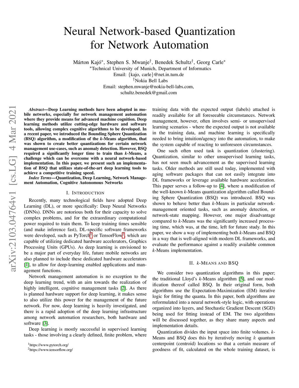 Deep Learning methods have been adopted in mobile networks, especially for network management automation where they provide means for advanced machine cognition. Deep learning methods utilize cutting-edge hardware and software tools, allowing complex cognitive algorithms to be developed. In a recent paper, we introduced the Bounding Sphere Quantization (BSQ) algorithm, a modification of the k-Means algorithm, that was shown to create better quantizations for certain network management use-cases, such as anomaly detection. However, BSQ required a significantly longer time to train than k-Means, a challenge which can be overcome with a neural network-based implementation. In this paper, we present such an implementation of BSQ that utilizes state-of-the-art deep learning tools to achieve a competitive training speed.