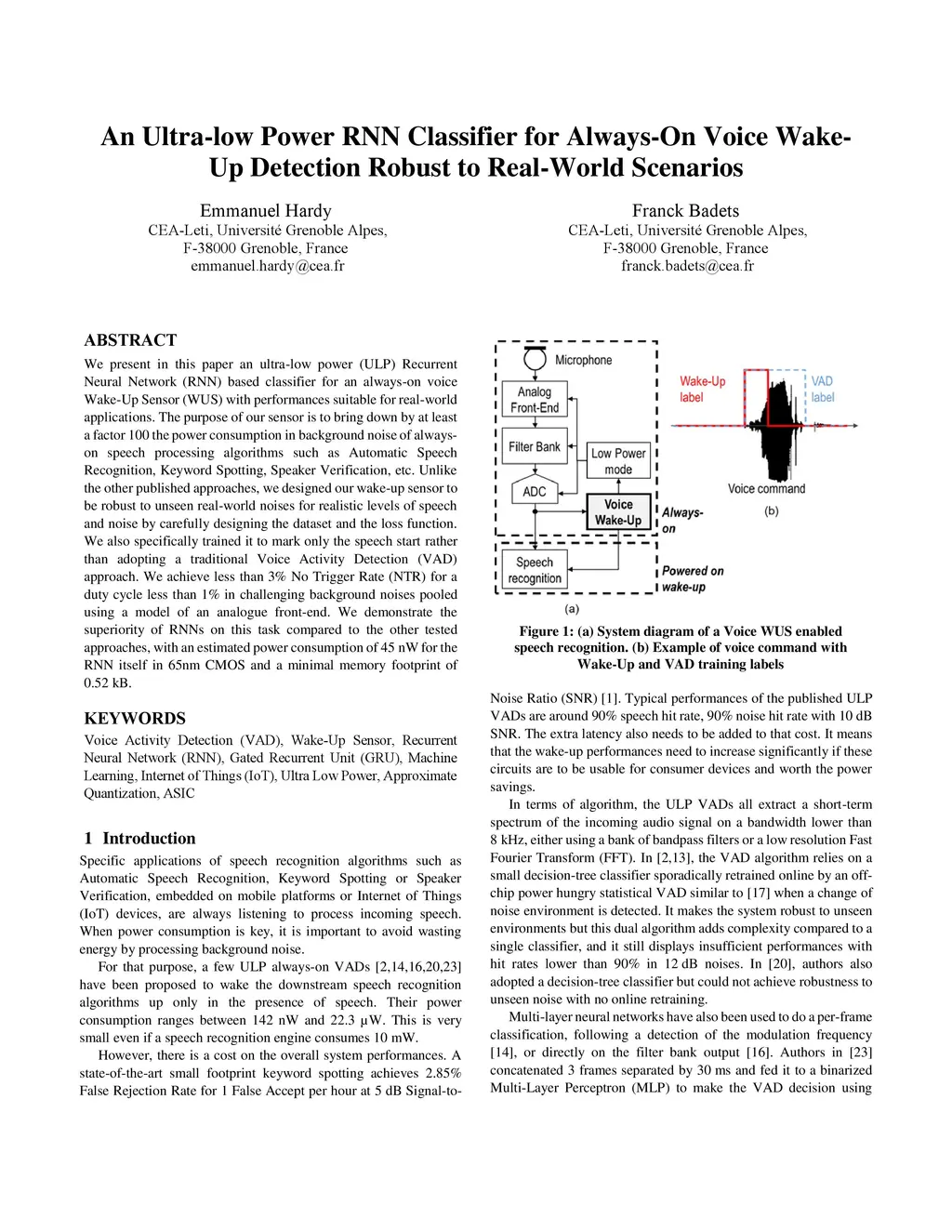 An Ultra-low Power RNN Classifier for Always-On Voice Wake-Up Detection