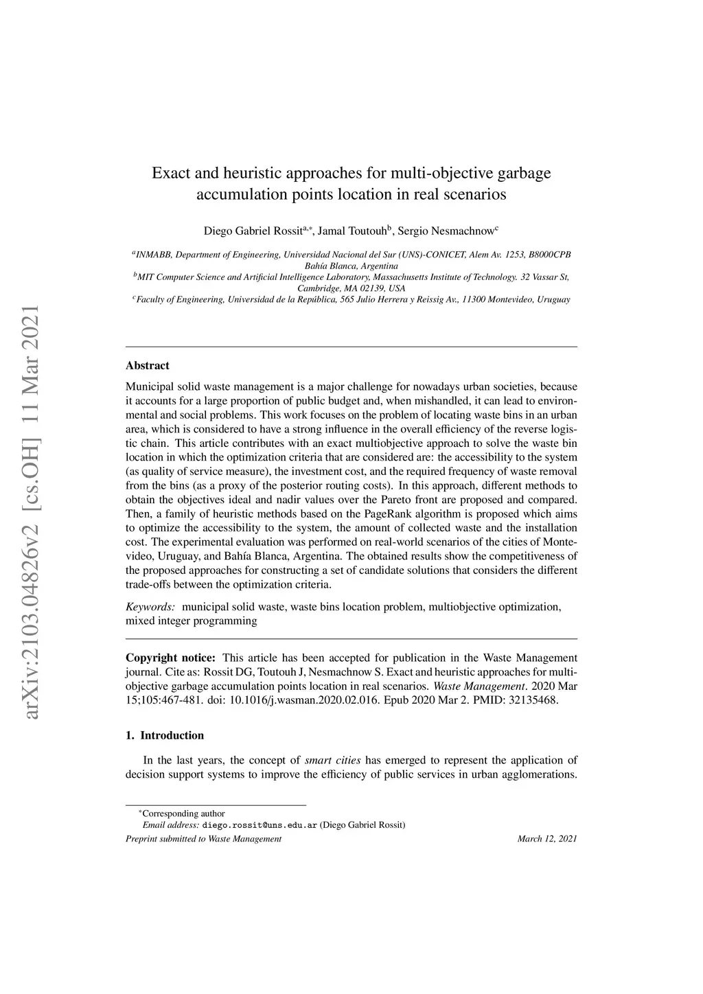 Municipal solid waste management is a major challenge for nowadays urban societies, because it accounts for a large proportion of public budget and, when mishandled, it can lead to environmental and social problems. This work focuses on the problem of locating waste bins in an urban area, which is considered to have a strong influence in the overall efficiency of the reverse logistic chain. This article contributes with an exact multiobjective approach to solve the waste bin location in which the optimization criteria that are considered are: the accessibility to the system (as quality of service measure), the investment cost, and the required frequency of waste removal from the bins (as a proxy of the posterior routing costs). In this approach, different methods to obtain the objectives ideal and nadir values over the Pareto front are proposed and compared. Then, a family of heuristic methods based on the PageRank algorithm is proposed which aims to optimize the accessibility to the system, the amount of collected waste and the installation cost. The experimental evaluation was performed on real-world scenarios of the cities of Montevideo, Uruguay, and Bah\ía Blanca, Argentina. The obtained results show the competitiveness of the proposed approaches for constructing a set of candidate solutions that considers the different trade-offs between the optimization criteria.
