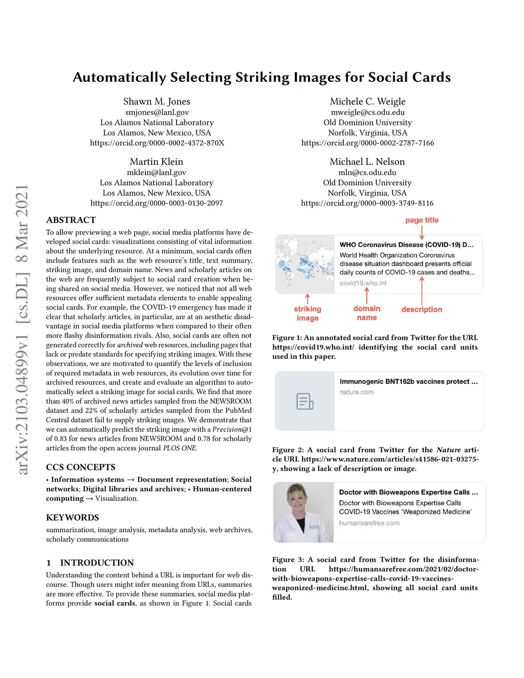 To allow previewing a web page, social media platforms have developed social cards: visualizations consisting of vital information about the underlying resource. At a minimum, social cards often include features such as the web resource's title, text summary, striking image, and domain name. News and scholarly articles on the web are frequently subject to social card creation when being shared on social media. However, we noticed that not all web resources offer sufficient metadata elements to enable appealing social cards. For example, the COVID-19 emergency has made it clear that scholarly articles, in particular, are at an aesthetic disadvantage in social media platforms when compared to their often more flashy disinformation rivals. Also, social cards are often not generated correctly for archived web resources, including pages that lack or predate standards for specifying striking images. With these observations, we are motivated to quantify the levels of inclusion of required metadata in web resources, its evolution over time for archived resources, and create and evaluate an algorithm to automatically select a striking image for social cards. We find that more than 40% of archived news articles sampled from the NEWSROOM dataset and 22% of scholarly articles sampled from the PubMed Central dataset fail to supply striking images. We demonstrate that we can automatically predict the striking image with a Precision@1 of 0.83 for news articles from NEWSROOM and 0.78 for scholarly articles from the open access journal PLOS ONE.