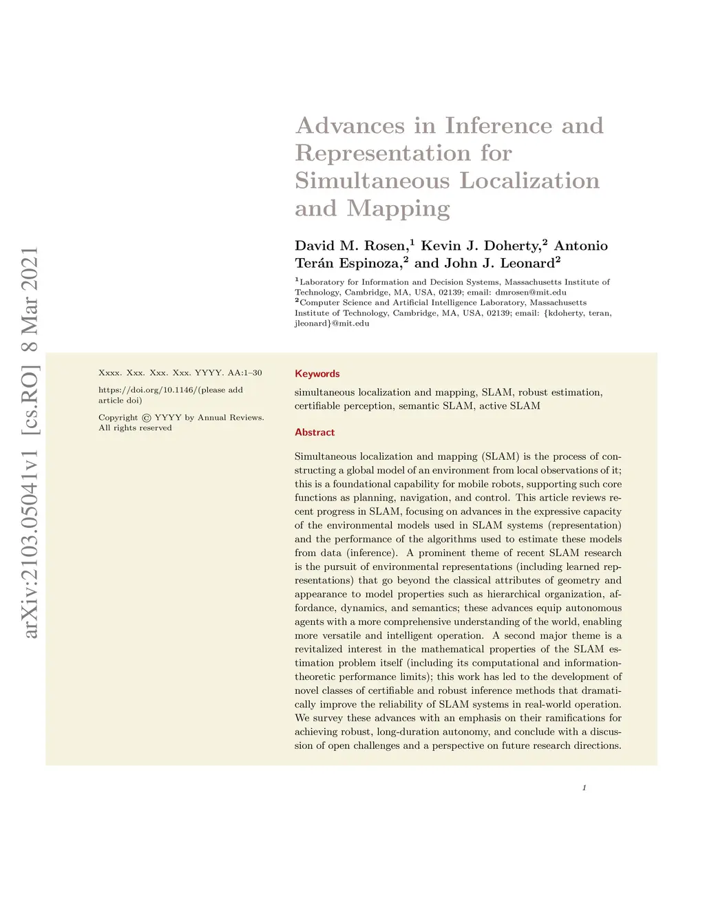 Simultaneous localization and mapping (SLAM) is the process of constructing a global model of an environment from local observations of it; this is a foundational capability for mobile robots, supporting such core functions as planning, navigation, and control. This article reviews recent progress in SLAM, focusing on advances in the expressive capacity of the environmental models used in SLAM systems (representation) and the performance of the algorithms used to estimate these models from data (inference). A prominent theme of recent SLAM research is the pursuit of environmental representations (including learned representations) that go beyond the classical attributes of geometry and appearance to model properties such as hierarchical organization, affordance, dynamics, and semantics; these advances equip autonomous agents with a more comprehensive understanding of the world, enabling more versatile and intelligent operation. A second major theme is a revitalized interest in the mathematical properties of the SLAM estimation problem itself (including its computational and information-theoretic performance limits); this work has led to the development of novel classes of certifiable and robust inference methods that dramatically improve the reliability of SLAM systems in real-world operation. We survey these advances with an emphasis on their ramifications for achieving robust, long-duration autonomy, and conclude with a discussion of open challenges and a perspective on future research directions.