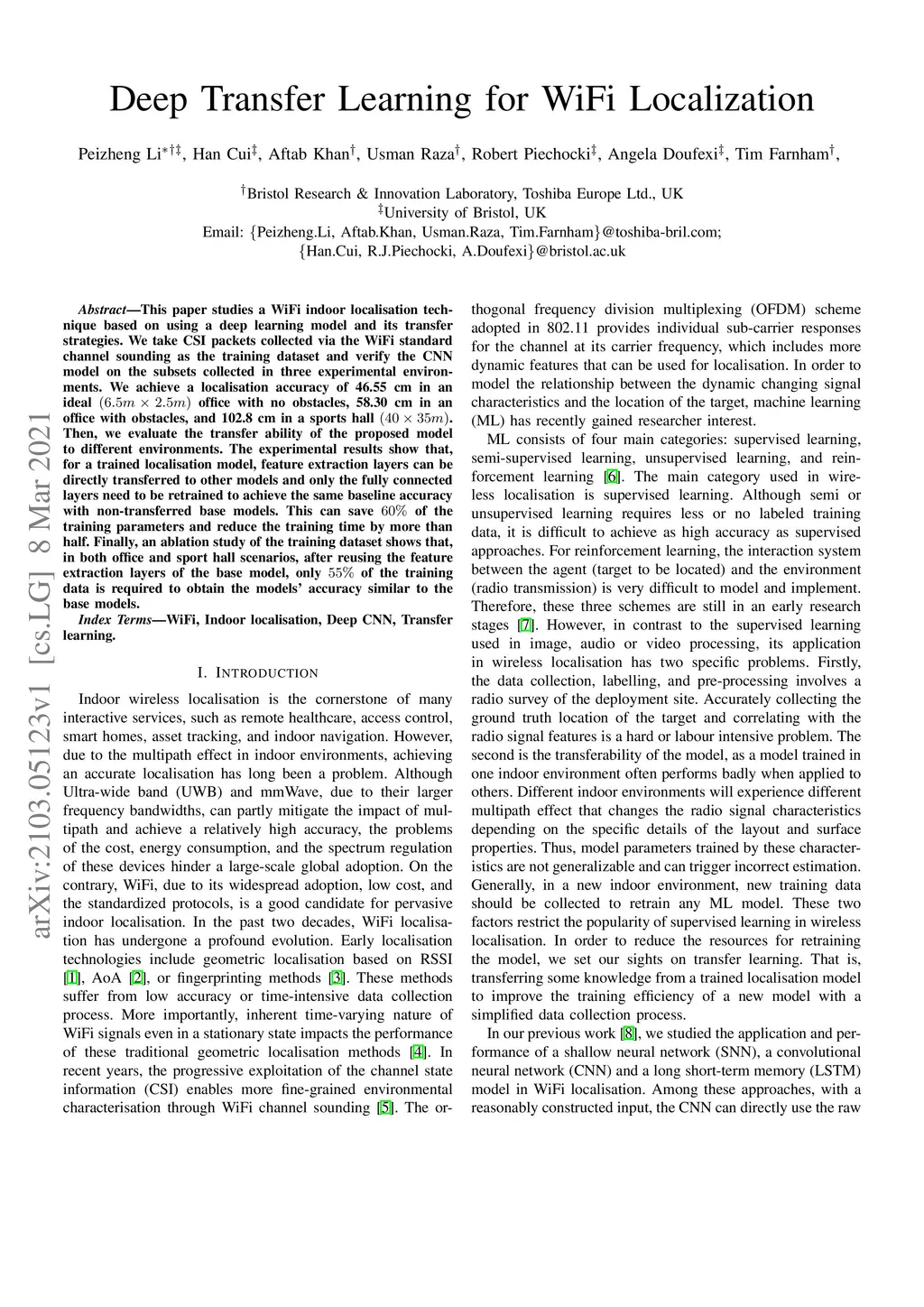 This paper studies a WiFi indoor localisation technique based on using a deep learning model and its transfer strategies. We take CSI packets collected via the WiFi standard channel sounding as the training dataset and verify the CNN model on the subsets collected in three experimental environments. We achieve a localisation accuracy of 46.55 cm in an ideal office with no obstacles, 58.30 cm in an office with obstacles, and 102.8 cm in a sports hall . Then, we evaluate the transfer ability of the proposed model to different environments. The experimental results show that, for a trained localisation model, feature extraction layers can be directly transferred to other models and only the fully connected layers need to be retrained to achieve the same baseline accuracy with non-transferred base models. This can save 60% of the training parameters and reduce the training time by more than half. Finally, an ablation study of the training dataset shows that, in both office and sport hall scenarios, after reusing the feature extraction layers of the base model, only 55% of the training data is required to obtain the models' accuracy similar to the base models.
