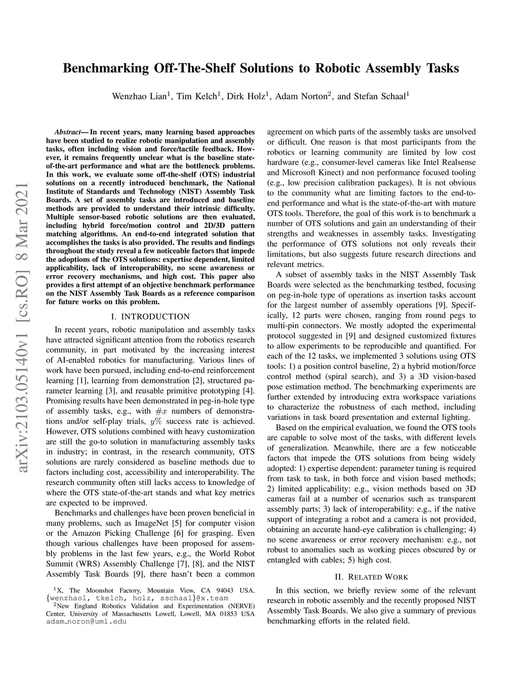In recent years, many learning based approaches have been studied to realize robotic manipulation and assembly tasks, often including vision and force/tactile feedback. However, it remains frequently unclear what is the baseline state-of-the-art performance and what are the bottleneck problems. In this work, we evaluate some off-the-shelf (OTS) industrial solutions on a recently introduced benchmark, the National Institute of Standards and Technology (NIST) Assembly Task Boards. A set of assembly tasks are introduced and baseline methods are provided to understand their intrinsic difficulty. Multiple sensor-based robotic solutions are then evaluated, including hybrid force/motion control and 2D/3D pattern matching algorithms. An end-to-end integrated solution that accomplishes the tasks is also provided. The results and findings throughout the study reveal a few noticeable factors that impede the adoptions of the OTS solutions: expertise dependent, limited applicability, lack of interoperability, no scene awareness or error recovery mechanisms, and high cost. This paper also provides a first attempt of an objective benchmark performance on the NIST Assembly Task Boards as a reference comparison for future works on this problem.
