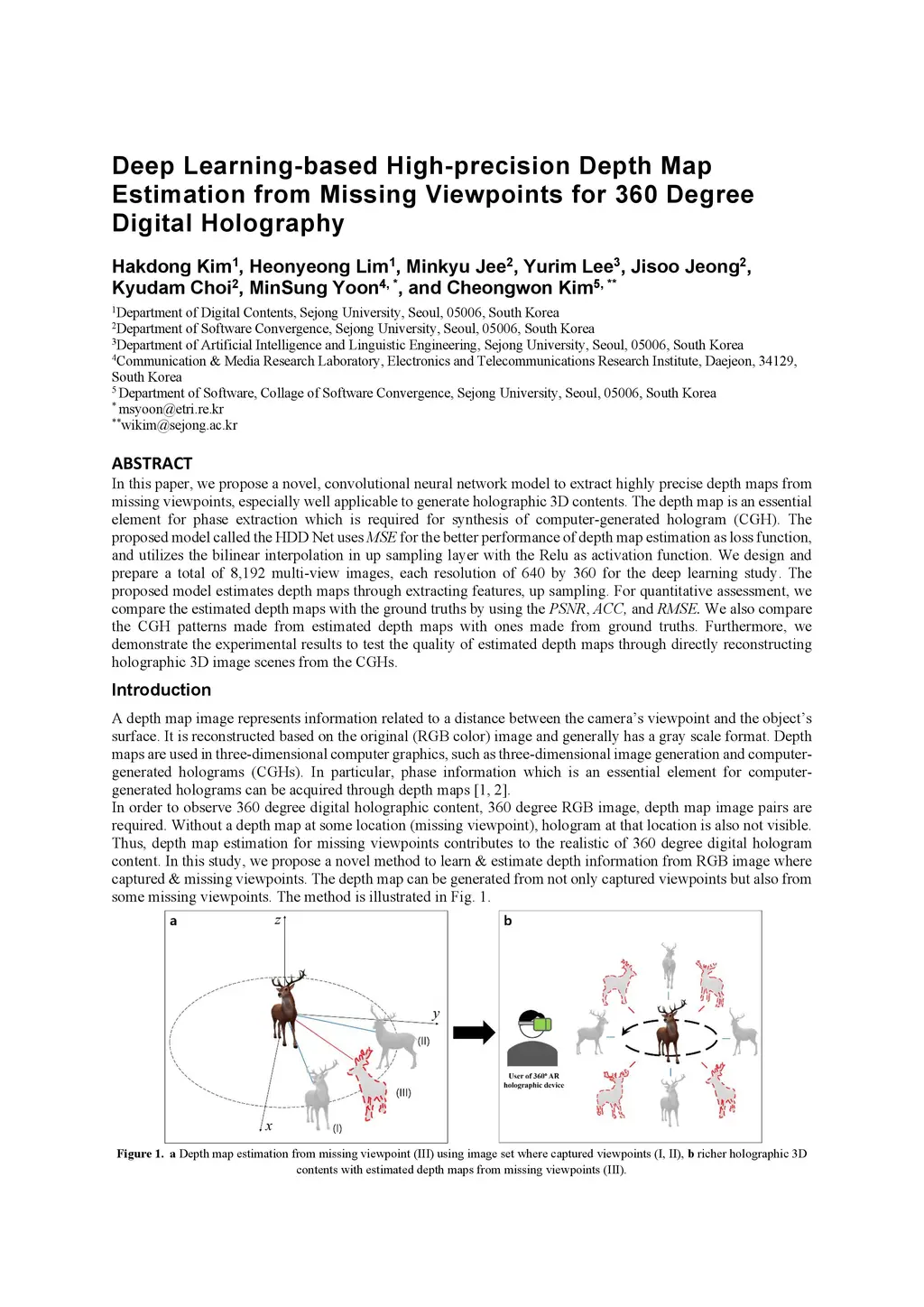 In this paper, we propose a novel, convolutional neural network model to extract highly precise depth maps from missing viewpoints, especially well applicable to generate holographic 3D contents. The depth map is an essential element for phase extraction which is required for synthesis of computer-generated hologram (CGH). The proposed model called the HDD Net uses MSE for the better performance of depth map estimation as loss function, and utilizes the bilinear interpolation in up sampling layer with the Relu as activation function. We design and prepare a total of 8,192 multi-view images, each resolution of 640 by 360 for the deep learning study. The proposed model estimates depth maps through extracting features, up sampling. For quantitative assessment, we compare the estimated depth maps with the ground truths by using the PSNR, ACC, and RMSE. We also compare the CGH patterns made from estimated depth maps with ones made from ground truths. Furthermore, we demonstrate the experimental results to test the quality of estimated depth maps through directly reconstructing holographic 3D image scenes from the CGHs.