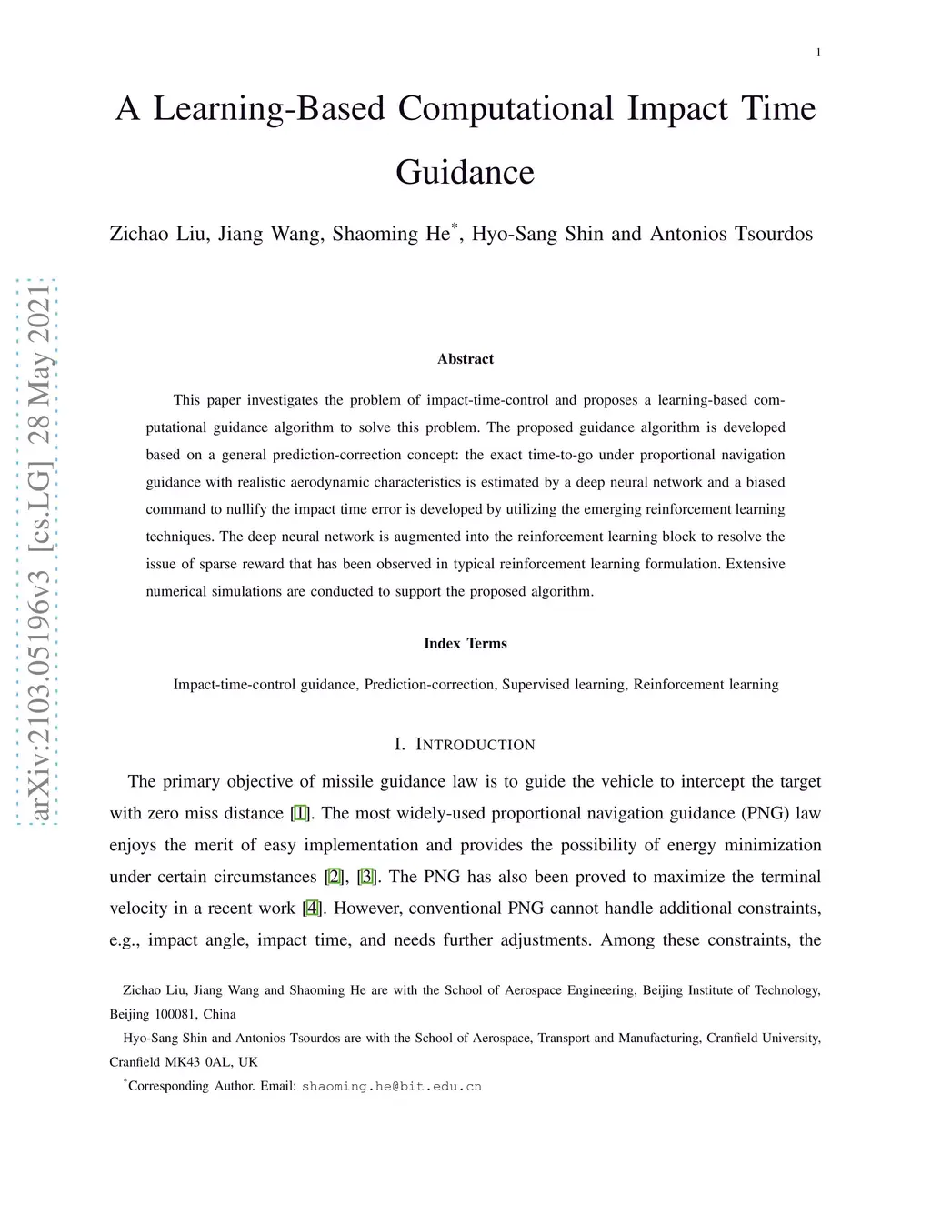 This paper investigates the problem of impact-time-control and proposes a learning-based computational guidance algorithm to solve this problem. The proposed guidance algorithm is developed based on a general prediction-correction concept: the exact time-to-go under proportional navigation guidance with realistic aerodynamic characteristics is estimated by a deep neural network and a biased command to nullify the impact time error is developed by utilizing the emerging reinforcement learning techniques. The deep neural network is augmented into the reinforcement learning block to resolve the issue of sparse reward that has been observed in typical reinforcement learning formulation. Extensive numerical simulations are conducted to support the proposed algorithm.