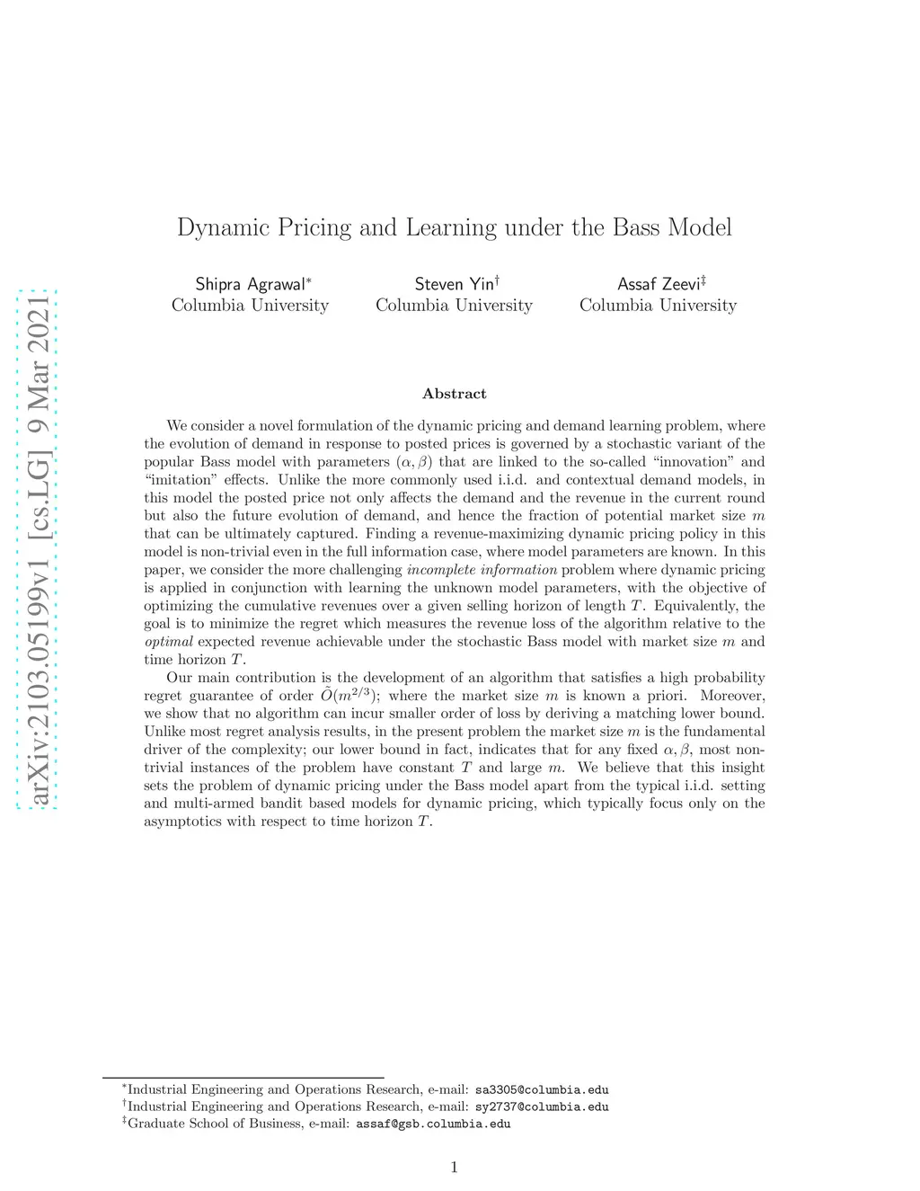 We consider a novel formulation of the dynamic pricing and demand learning problem, where the evolution of demand in response to posted prices is governed by a stochastic variant of the popular Bass model with parameters that are linked to the so-called "innovation" and "imitation" effects. Unlike the more commonly used i.i.d. and contextual demand models, in this model the posted price not only affects the demand and the revenue in the current round but also the future evolution of demand, and hence the fraction of potential market size that can be ultimately captured. In this paper, we consider the more challenging incomplete information problem where dynamic pricing is applied in conjunction with learning the unknown parameters, with the objective of optimizing the cumulative revenues over a given selling horizon of length . Equivalently, the goal is to minimize the regret which measures the revenue loss of the algorithm relative to the optimal expected revenue achievable under the stochastic Bass model with market size and time horizon . Our main contribution is the development of an algorithm that satisfies a high probability regret guarantee of order ; where the market size is known a priori. Moreover, we show that no algorithm can incur smaller order of loss by deriving a matching lower bound. Unlike most regret analysis results, in the present problem the market size is the fundamental driver of the complexity; our lower bound in fact, indicates that for any fixed , most non-trivial instances of the problem have constant and large . We believe that this insight sets the problem of dynamic pricing under the Bass model apart from the typical i.i.d. setting and multi-armed bandit based models for dynamic pricing, which typically focus only on the asymptotics with respect to time horizon .