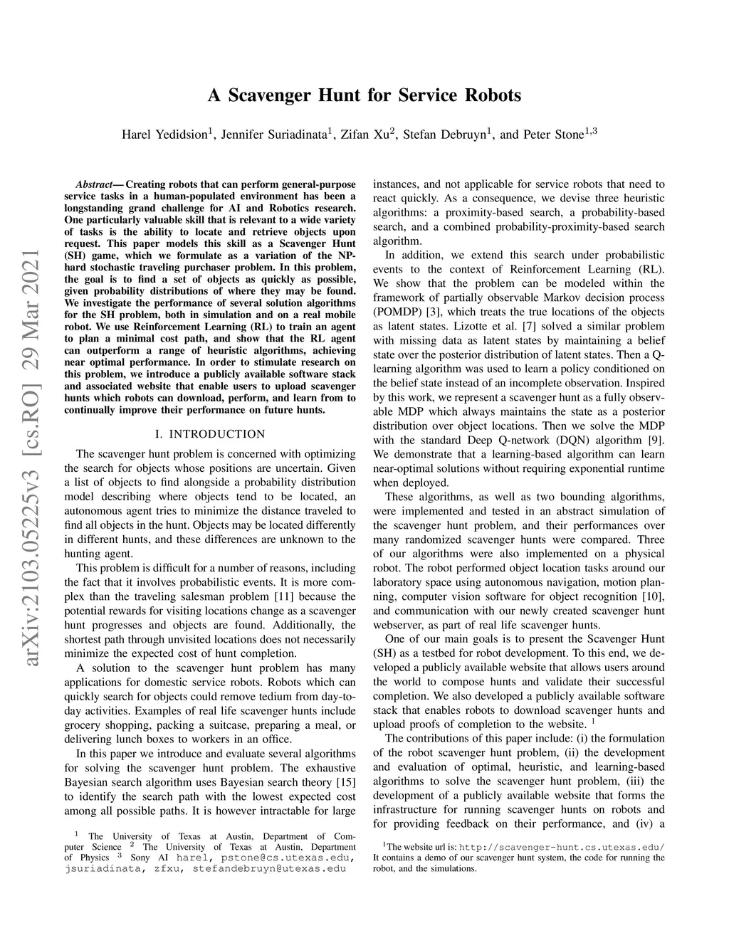 Creating robots that can perform general-purpose service tasks in a human-populated environment has been a longstanding grand challenge for AI and Robotics research. One particularly valuable skill that is relevant to a wide variety of tasks is the ability to locate and retrieve objects upon request. This paper models this skill as a Scavenger Hunt (SH) game, which we formulate as a variation of the NP-hard stochastic traveling purchaser problem. In this problem, the goal is to find a set of objects as quickly as possible, given probability distributions of where they may be found. We investigate the performance of several solution algorithms for the SH problem, both in simulation and on a real mobile robot. We use Reinforcement Learning (RL) to train an agent to plan a minimal cost path, and show that the RL agent can outperform a range of heuristic algorithms, achieving near optimal performance. In order to stimulate research on this problem, we introduce a publicly available software stack and associated website that enable users to upload scavenger hunts which robots can download, perform, and learn from to continually improve their performance on future hunts.