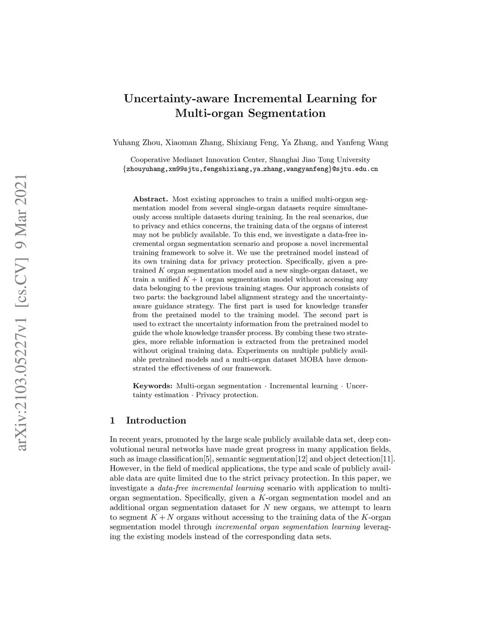Most existing approaches to train a unified multi-organ segmentation model from several single-organ datasets require simultaneously access multiple datasets during training. In the real scenarios, due to privacy and ethics concerns, the training data of the organs of interest may not be publicly available. To this end, we investigate a data-free incremental organ segmentation scenario and propose a novel incremental training framework to solve it. We use the pretrained model instead of its own training data for privacy protection. Specifically, given a pretrained organ segmentation model and a new single-organ dataset, we train a unified organ segmentation model without accessing any data belonging to the previous training stages. Our approach consists of two parts: the background label alignment strategy and the uncertainty-aware guidance strategy. The first part is used for knowledge transfer from the pretained model to the training model. The second part is used to extract the uncertainty information from the pretrained model to guide the whole knowledge transfer process. By combing these two strategies, more reliable information is extracted from the pretrained model without original training data. Experiments on multiple publicly available pretrained models and a multi-organ dataset MOBA have demonstrated the effectiveness of our framework.