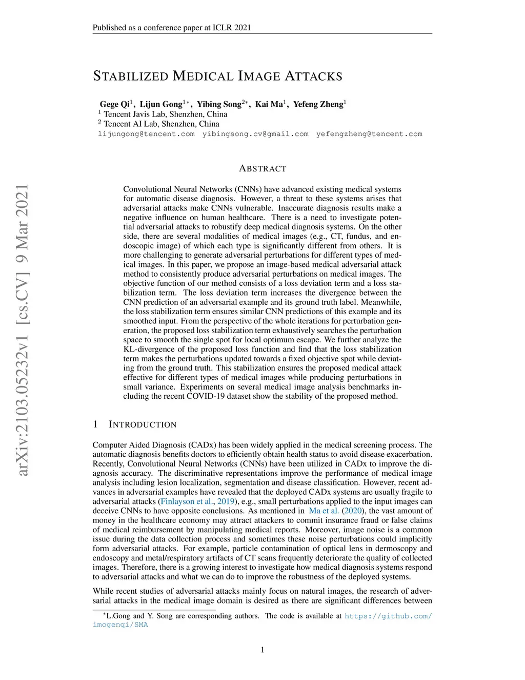 Convolutional Neural Networks (CNNs) have advanced existing medical systems for automatic disease diagnosis. However, a threat to these systems arises that adversarial attacks make CNNs vulnerable. Inaccurate diagnosis results make a negative influence on human healthcare. There is a need to investigate potential adversarial attacks to robustify deep medical diagnosis systems. On the other side, there are several modalities of medical images (e.g., CT, fundus, and endoscopic image) of which each type is significantly different from others. It is more challenging to generate adversarial perturbations for different types of medical images. In this paper, we propose an image-based medical adversarial attack method to consistently produce adversarial perturbations on medical images. The objective function of our method consists of a loss deviation term and a loss stabilization term. The loss deviation term increases the divergence between the CNN prediction of an adversarial example and its ground truth label. Meanwhile, the loss stabilization term ensures similar CNN predictions of this example and its smoothed input. From the perspective of the whole iterations for perturbation generation, the proposed loss stabilization term exhaustively searches the perturbation space to smooth the single spot for local optimum escape. We further analyze the KL-divergence of the proposed loss function and find that the loss stabilization term makes the perturbations updated towards a fixed objective spot while deviating from the ground truth. This stabilization ensures the proposed medical attack effective for different types of medical images while producing perturbations in small variance. Experiments on several medical image analysis benchmarks including the recent COVID-19 dataset show the stability of the proposed method.