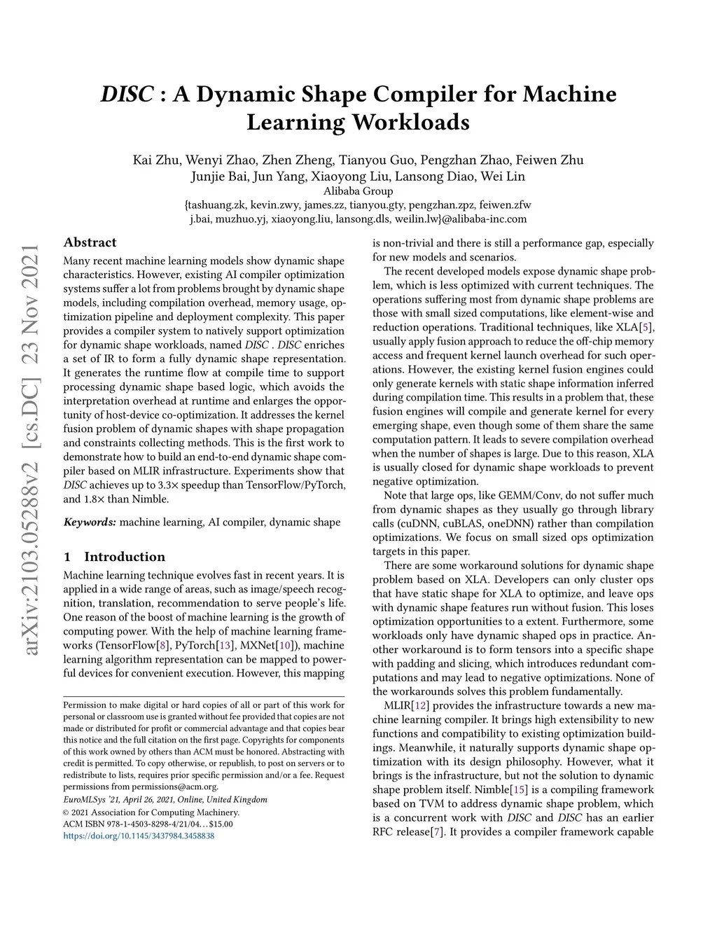 DISC: A Dynamic Shape Compiler for Machine Learning Workloads