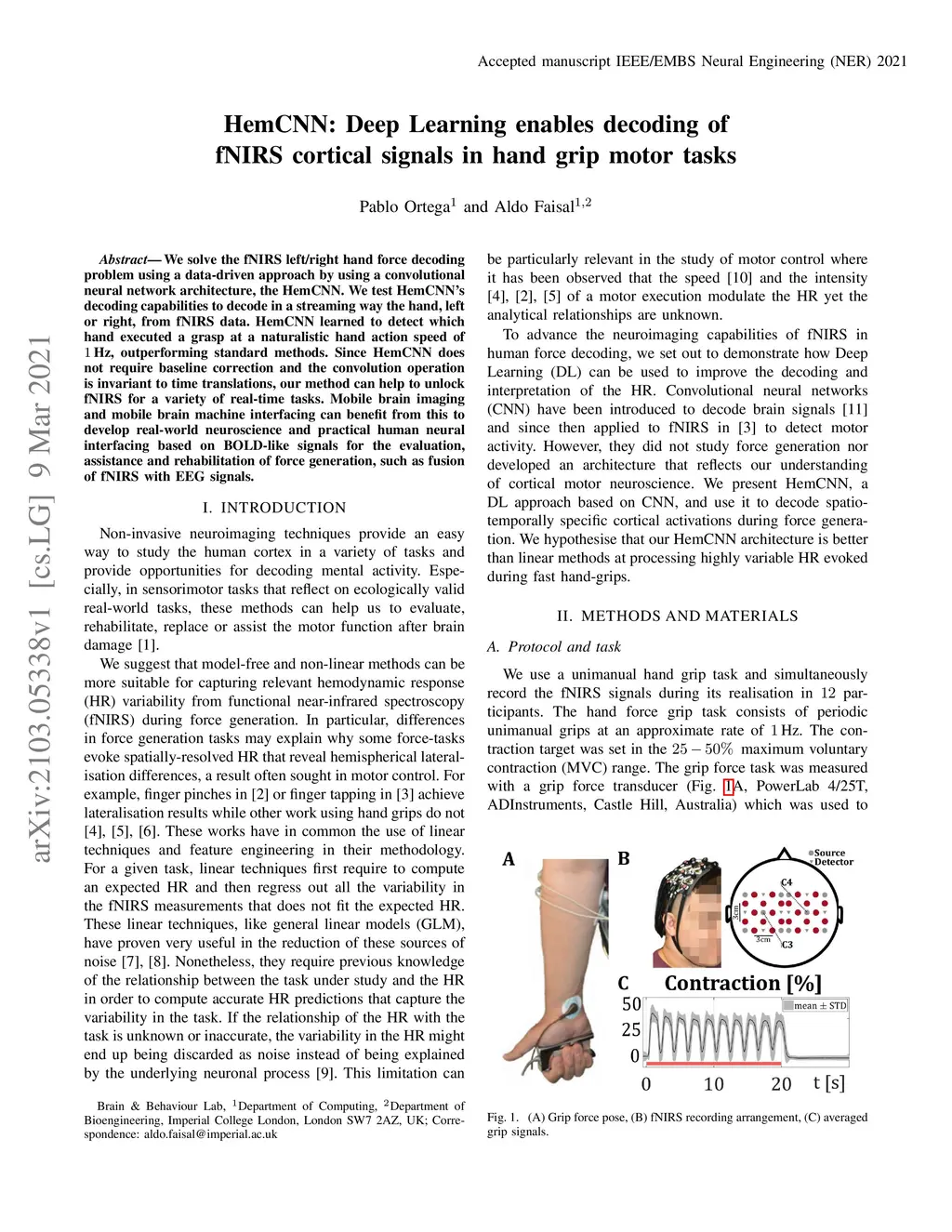 HemCNN: Deep Learning enables decoding of fNIRS cortical signals in hand