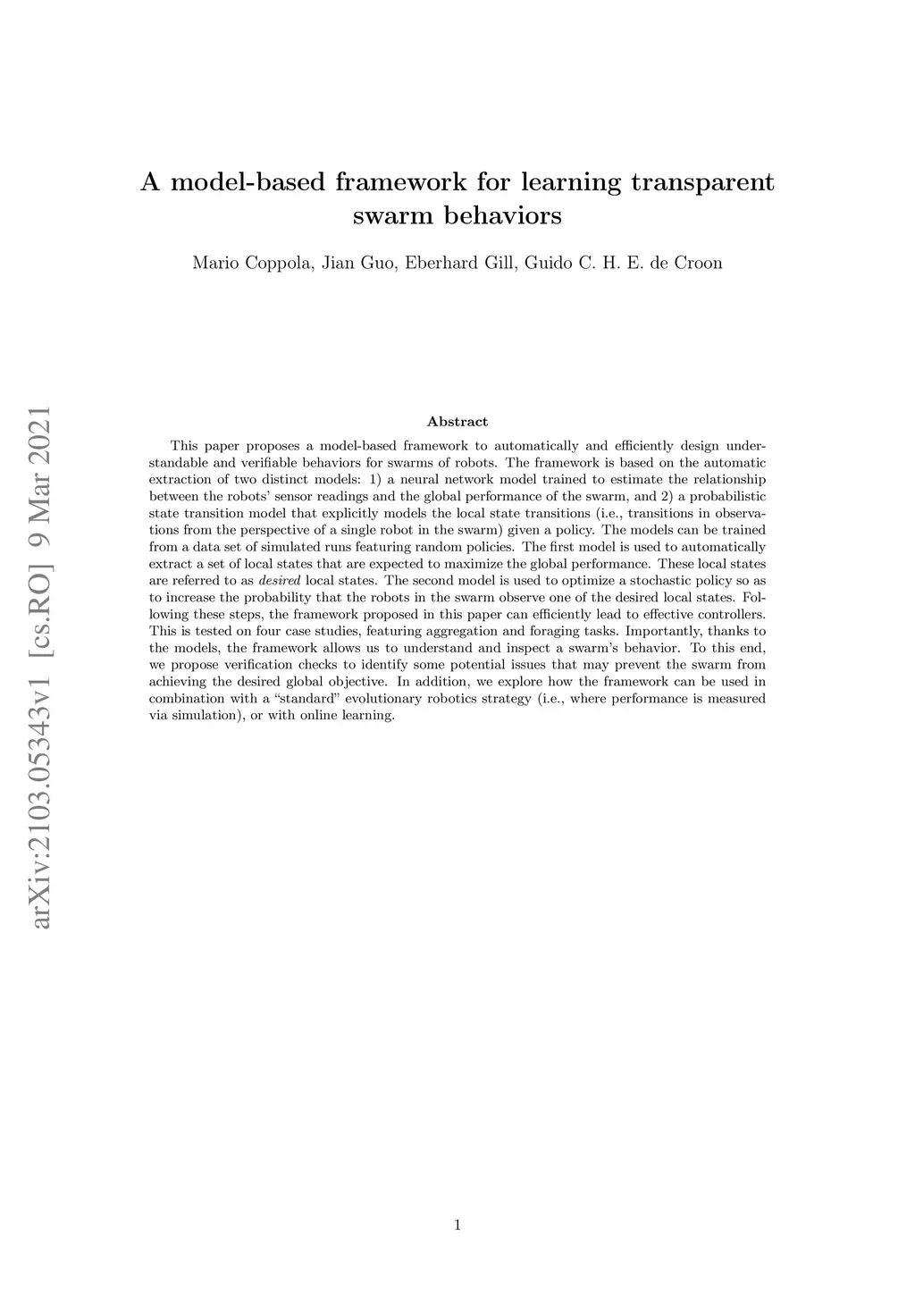 This paper proposes a model-based framework to automatically and efficiently design understandable and verifiable behaviors for swarms of robots. The framework is based on the automatic extraction of two distinct models: 1) a neural network model trained to estimate the relationship between the robots' sensor readings and the global performance of the swarm, and 2) a probabilistic state transition model that explicitly models the local state transitions (i.e., transitions in observations from the perspective of a single robot in the swarm) given a policy. The models can be trained from a data set of simulated runs featuring random policies. The first model is used to automatically extract a set of local states that are expected to maximize the global performance. These local states are referred to as desired local states. The second model is used to optimize a stochastic policy so as to increase the probability that the robots in the swarm observe one of the desired local states. Following these steps, the framework proposed in this paper can efficiently lead to effective controllers. This is tested on four case studies, featuring aggregation and foraging tasks. Importantly, thanks to the models, the framework allows us to understand and inspect a swarm's behavior. To this end, we propose verification checks to identify some potential issues that may prevent the swarm from achieving the desired global objective. In addition, we explore how the framework can be used in combination with a "standard" evolutionary robotics strategy (i.e., where performance is measured via simulation), or with online learning.